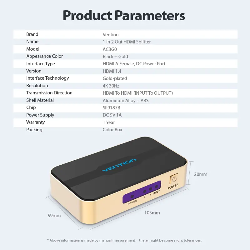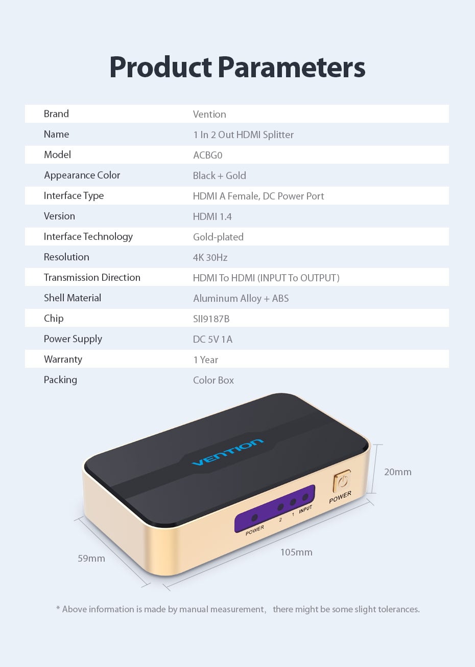 Tính năng Bộ Chia HDMI Splitter 1 In 2 Out 4K VENTION ACB (4K@30Hz)