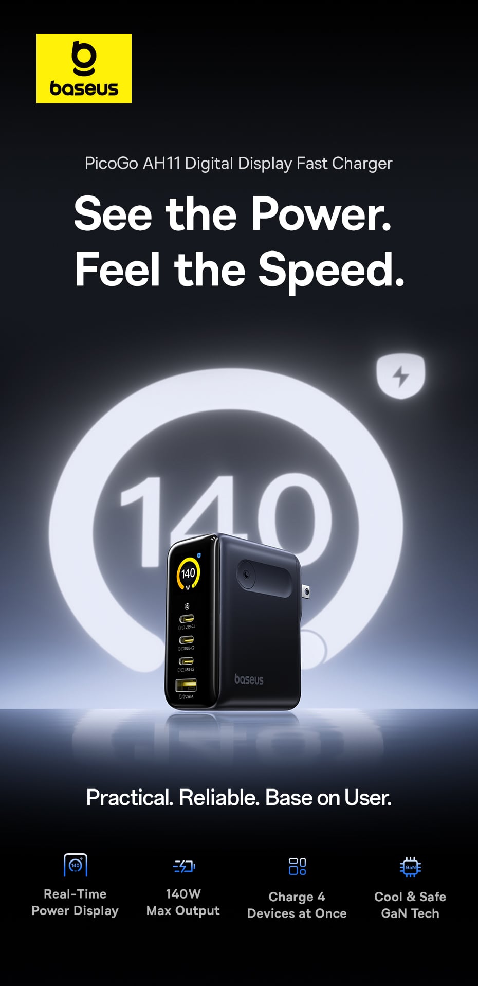 Giới thiệu Củ Sạc Nhanh Baseus PicoGo AH11 140W (3*Type-C + 1*USB-A port, Digital Display, Includes Dura Fast Charging Cable C to C 240W 1.5m)