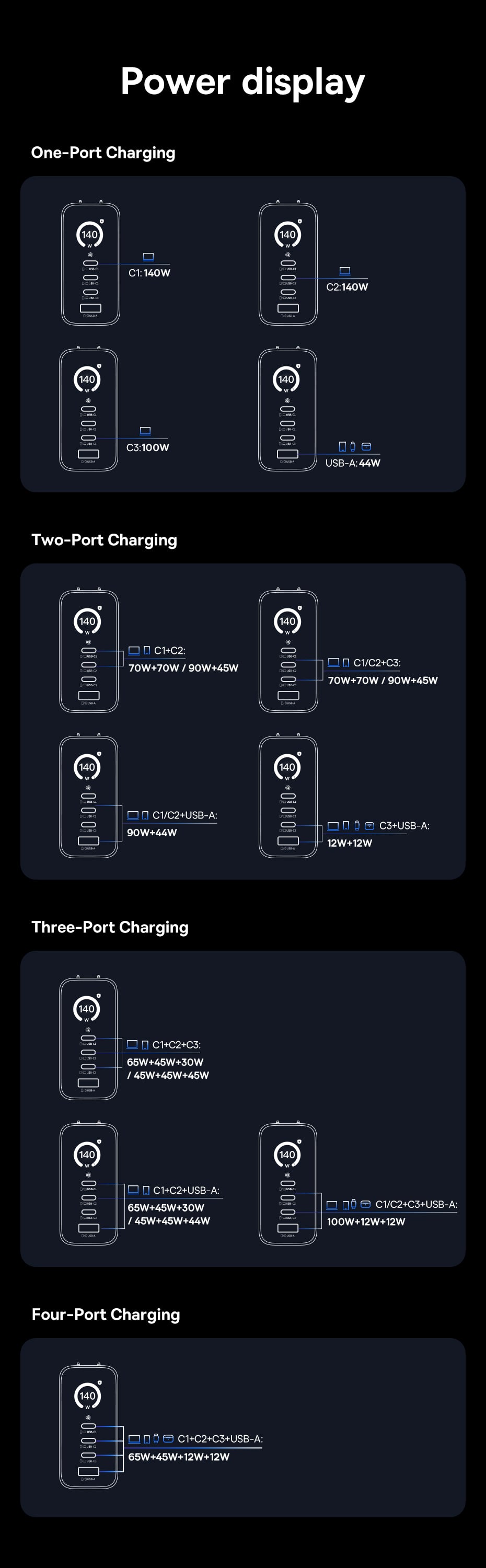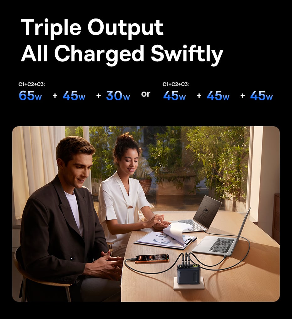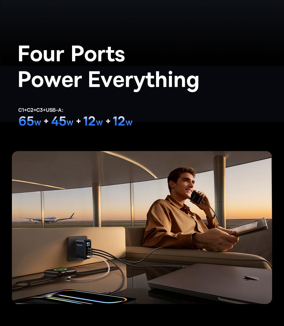 Sản phẩm được trang bị tổng cộng 4 cổng sạc, bao gồm 3 cổng Type-C và 1 cổng USB-A, cho phép bạn nạp năng lượng cùng lúc cho 4 thiết bị khác nhau. Công nghệ phân bổ dòng điện thông minh sẽ tự động chia nhỏ công suất phù hợp cho từng thiết bị, đảm bảo sạc nhanh mà không gây chai pin hay quá nhiệt.