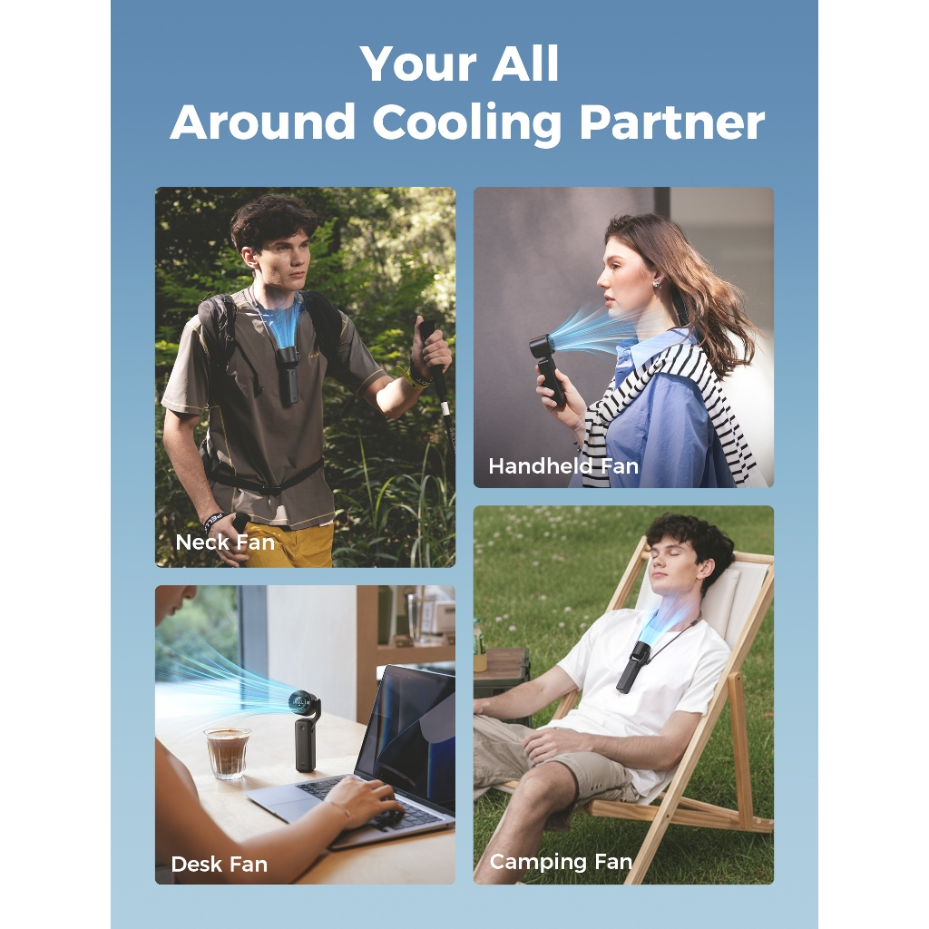 - Quạt đeo cổ (Neck Fan): Kết hợp với dây đeo (lanyard) và chỉnh góc gió hướng lên trên, biến nó thành chiếc điều hòa di động rảnh tay khi đi dạo hoặc làm việc nhà.