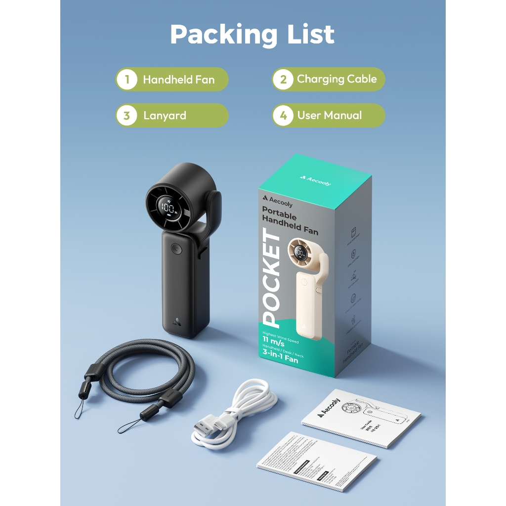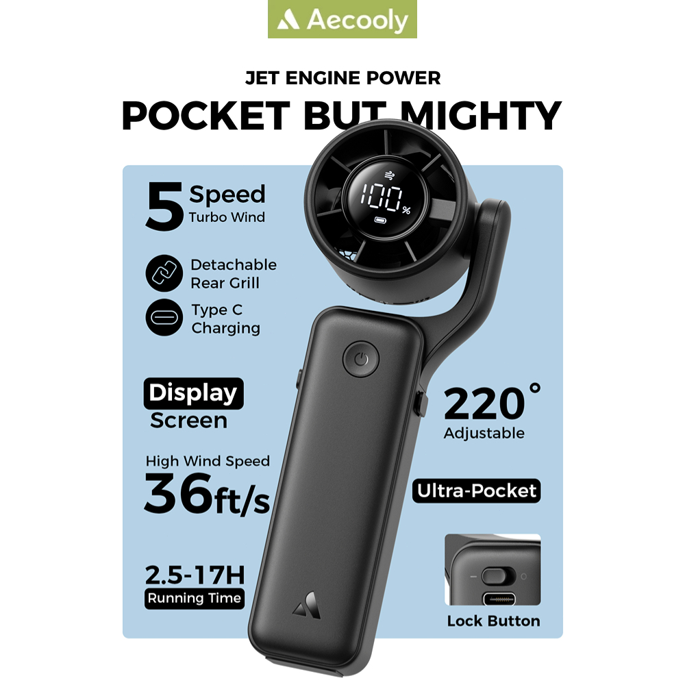 Giới thiệu Quạt Cầm Tay AECOOLY AirGimbal (3500mAh, 17H, Display Screen, 11m/s, 15000RPM, 220° Adjustable, 5-Speed Turbo Wind)
