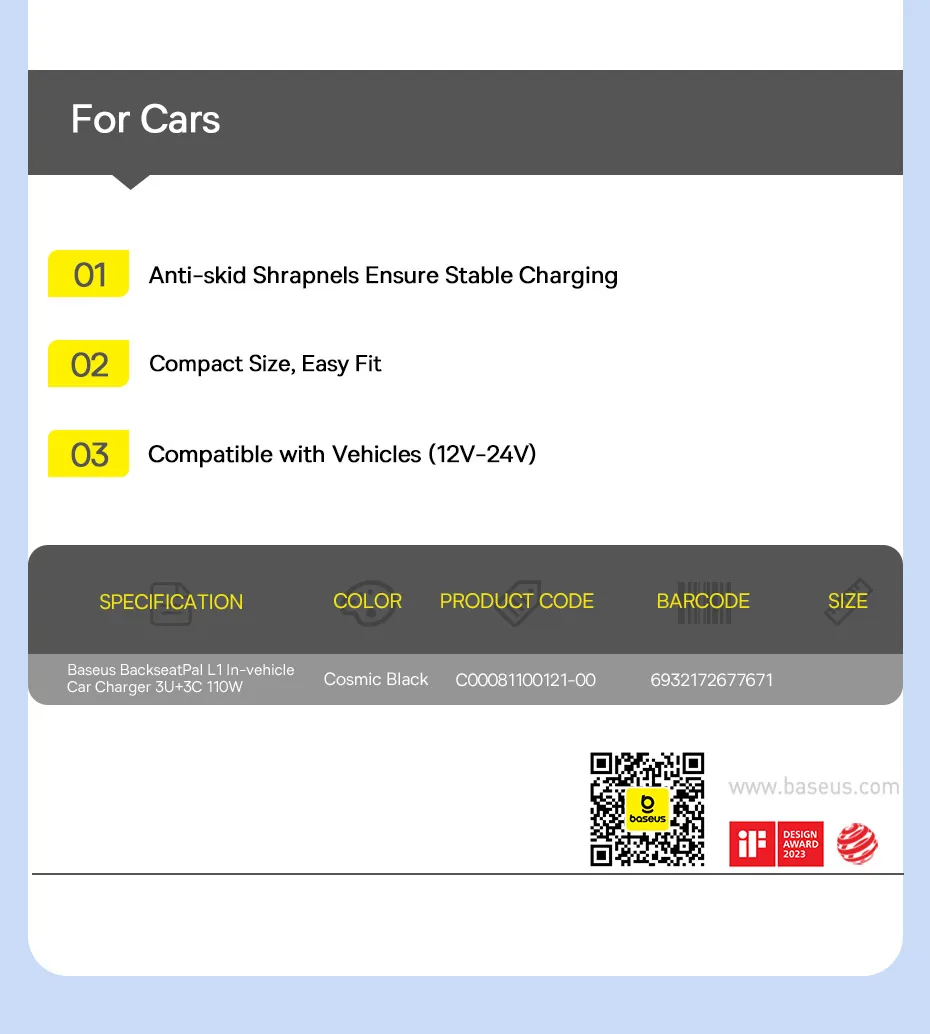 • Tên tiếng Việt: Tẩu Sạc Cho Ô Tô Baseus BackseatPal L1 In-vehicle 3U+3C 110W (with 1.5m Extension Cord Cable)