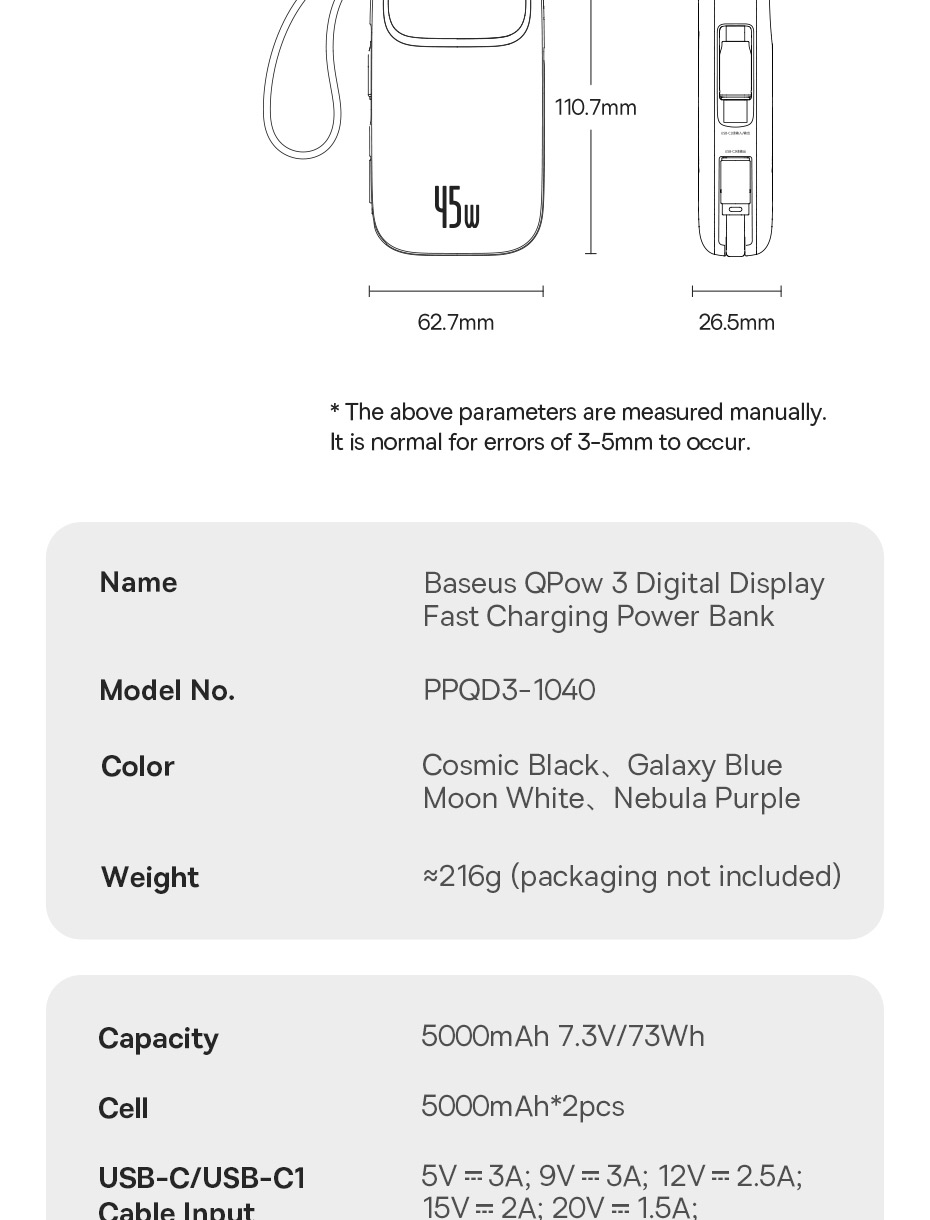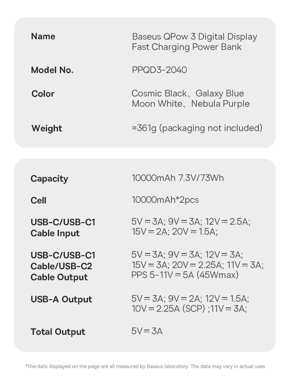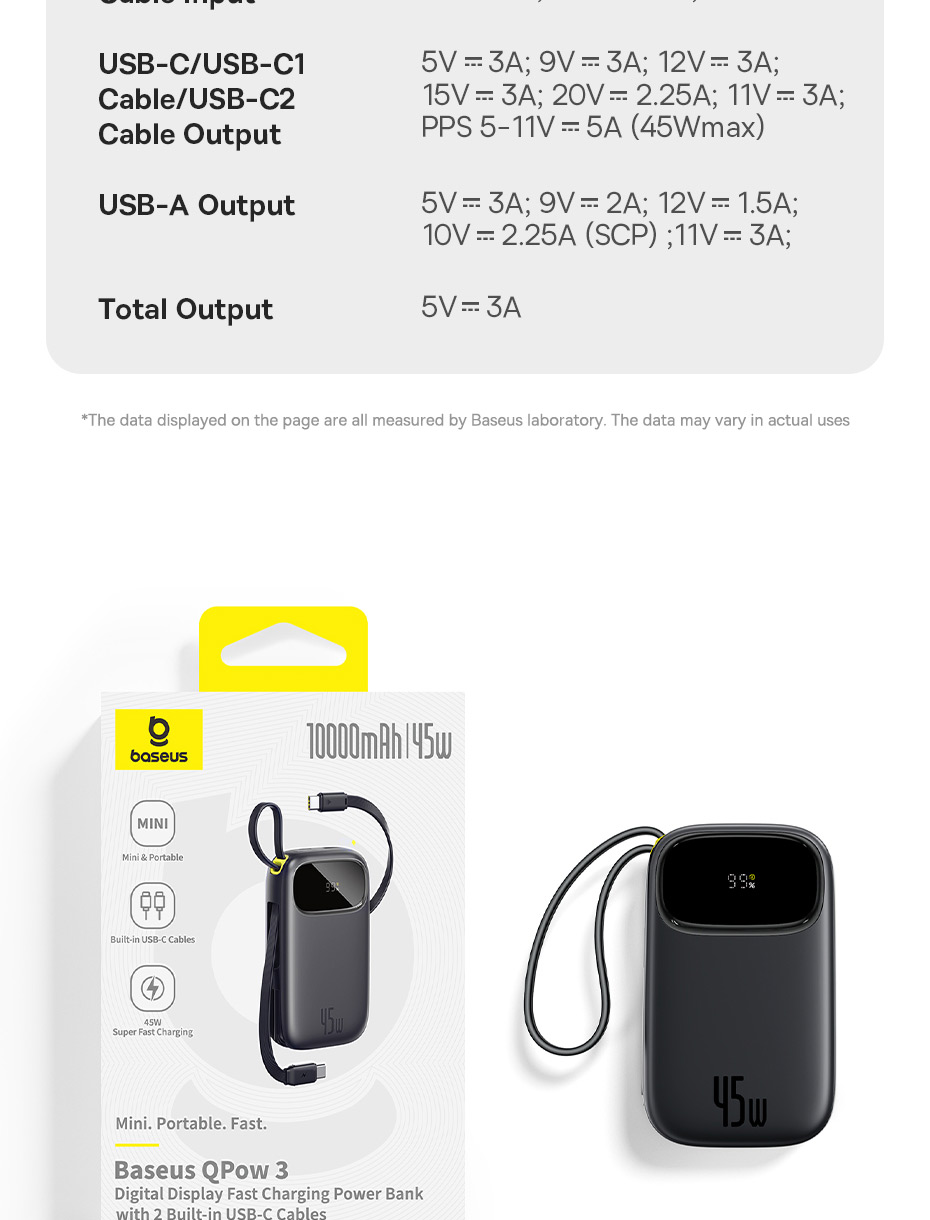 • Tên tiếng Việt: Pin Dự Phòng Baseus EnerFill FC31 QPow 3 2*Type-C Cable Version 45W (10000mAh, Digital Display)