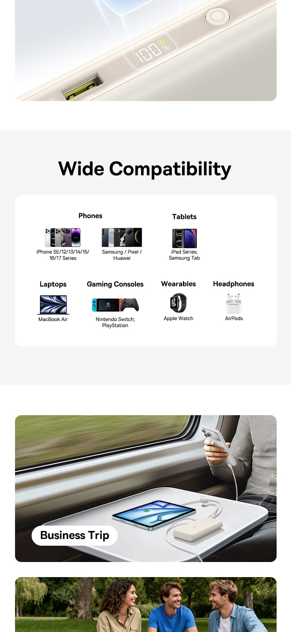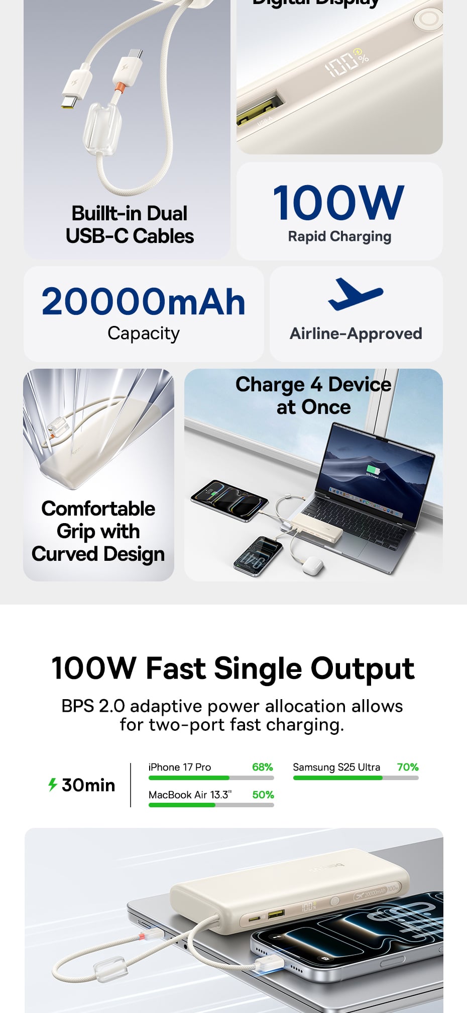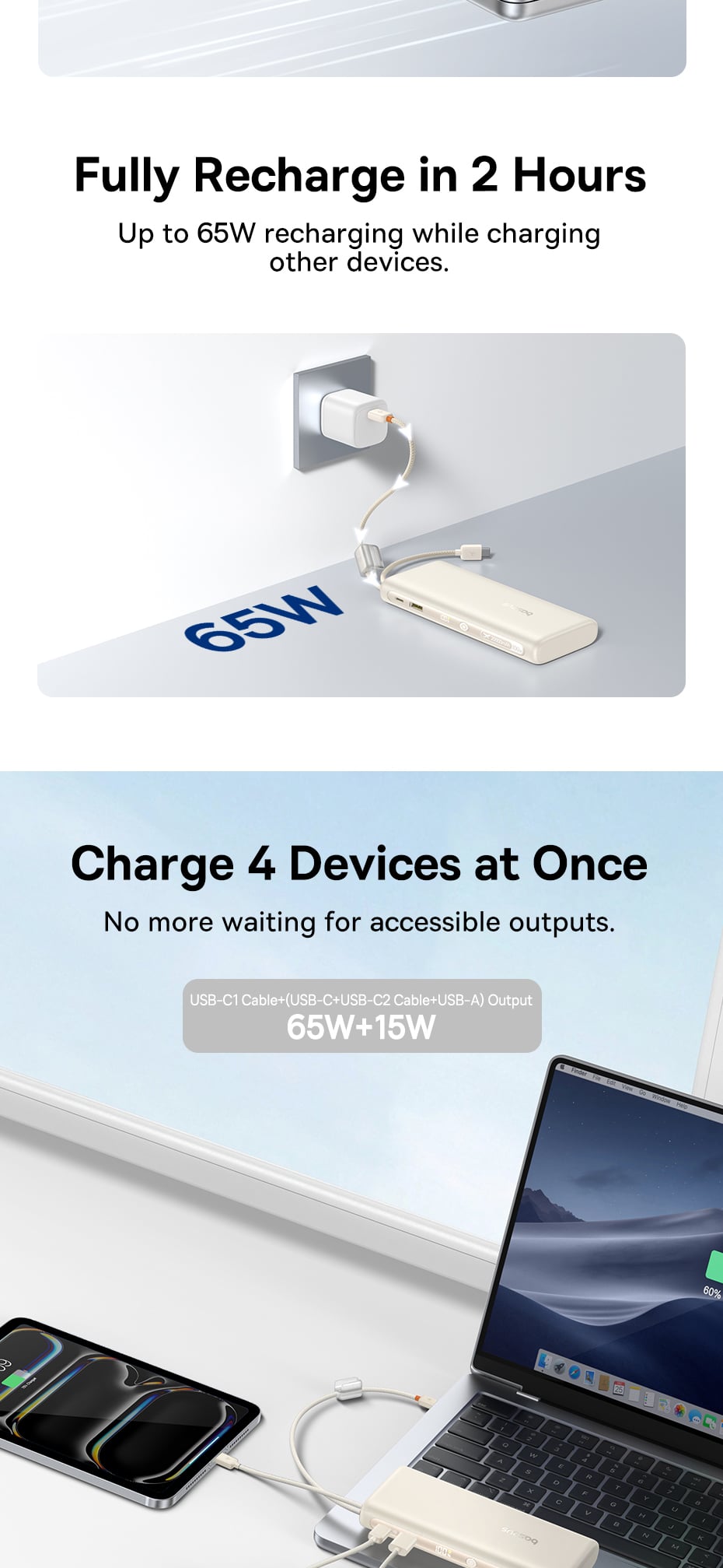 Ngoài 2 cáp Type-C tích hợp, pin còn sở hữu 1 cổng Type-C và 1 cổng USB-A rời. Công nghệ phân bổ dòng điện thông minh của Baseus cho phép bạn sạc cùng lúc lên đến 4 thiết bị. Ngay cả khi sạc song song, pin vẫn tối ưu hóa công suất một cách an toàn (ví dụ: chia dòng 65W + 35W, hoặc 65W + 22.5W), giúp các thiết bị đều được nạp đầy nhanh chóng mà không lo quá nhiệt.