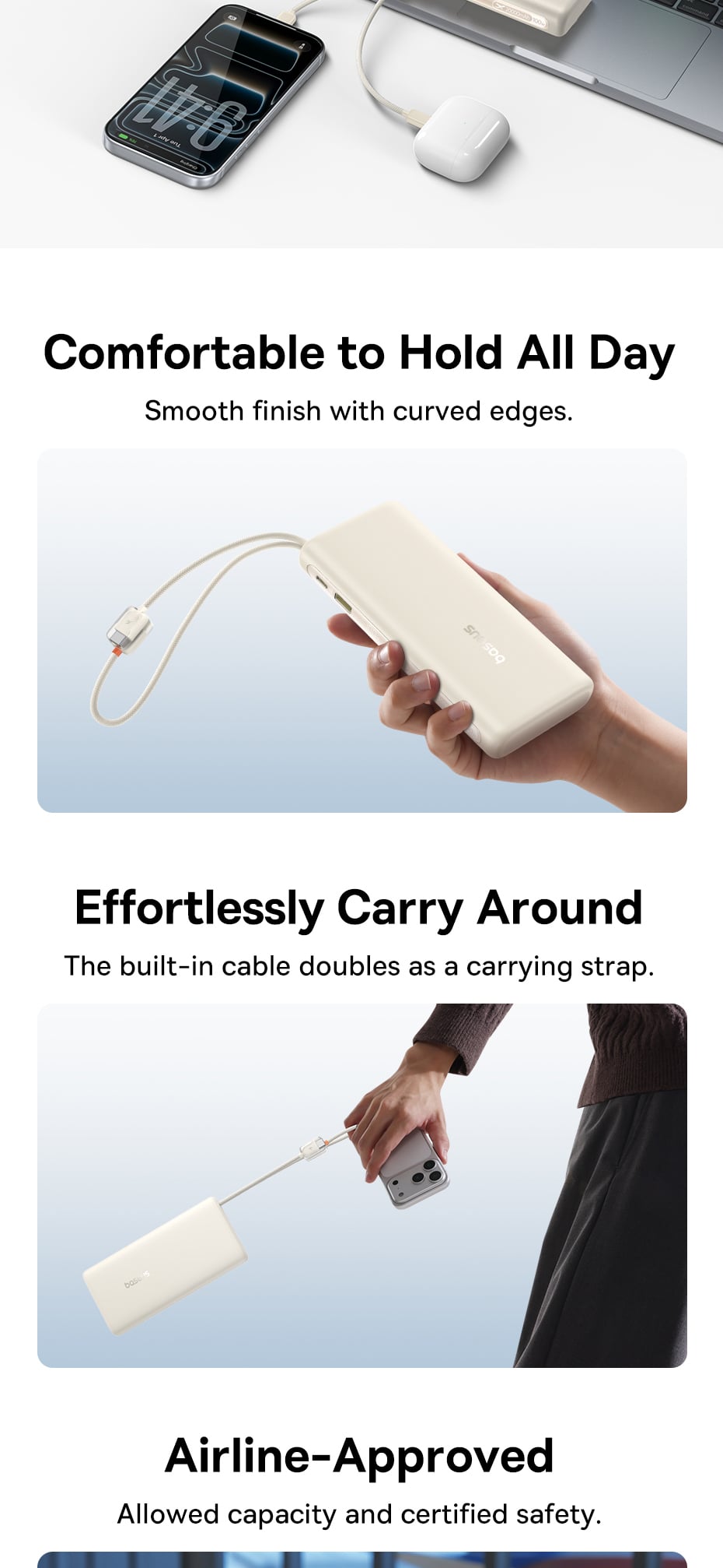 Bạn thường xuyên quên mang theo cáp sạc? Baseus EnerFill FC41 giải quyết triệt để vấn đề này khi được tích hợp sẵn 2 cáp sạc Type-C (Dual Built-in USB-C Cables) ngay trên thân pin. Hai sợi cáp này hỗ trợ sạc nhanh công suất cao (lên đến 65W/35W), thiết kế gọn gàng, bền bỉ và luôn sẵn sàng mỗi khi bạn cần.