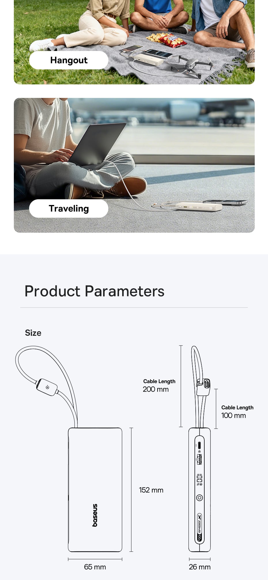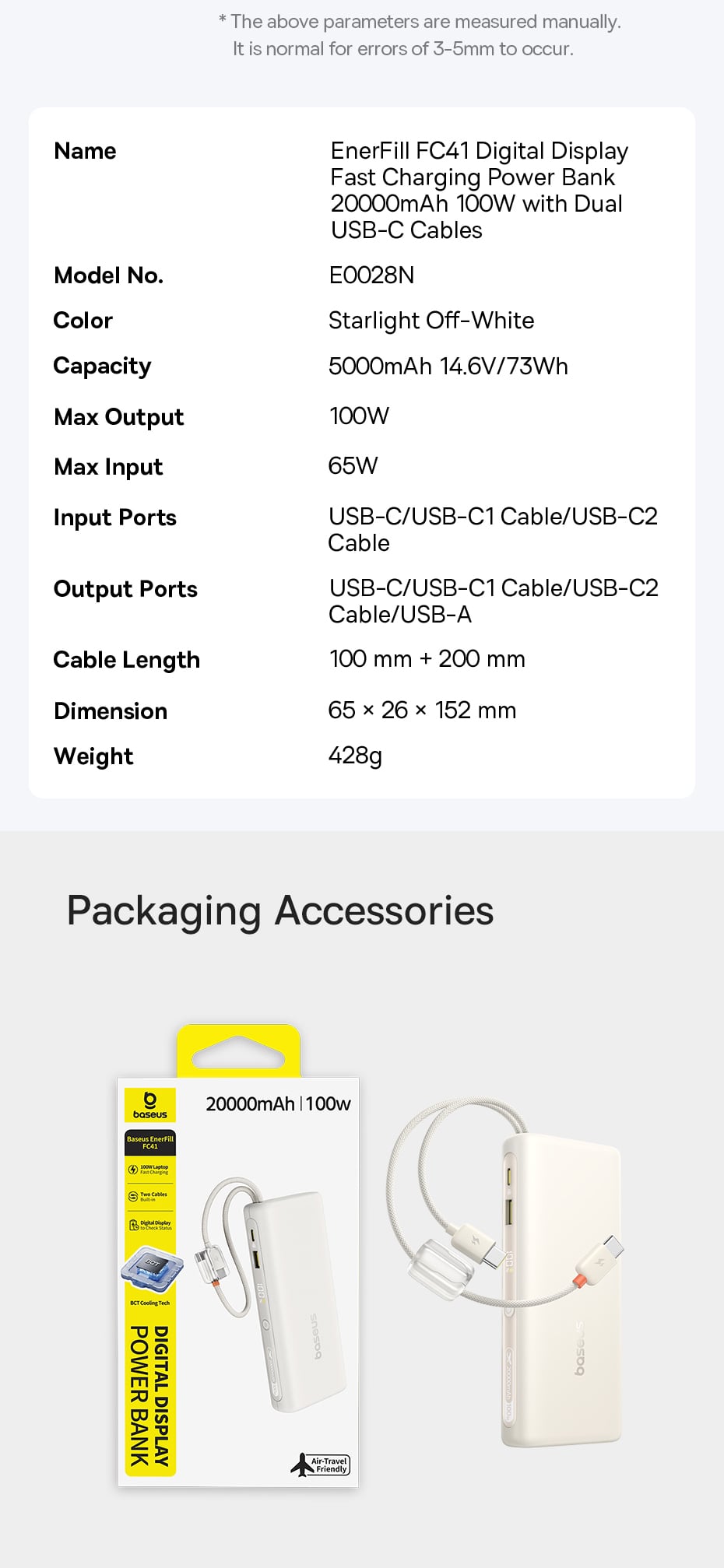 Hình Ảnh Pin Dự Phòng Baseus EnerFill FC41 20000mAh 100W (Digital Display, with Dual Built-in USB-C Cables, 1*Type-C + 1*USB-A port)