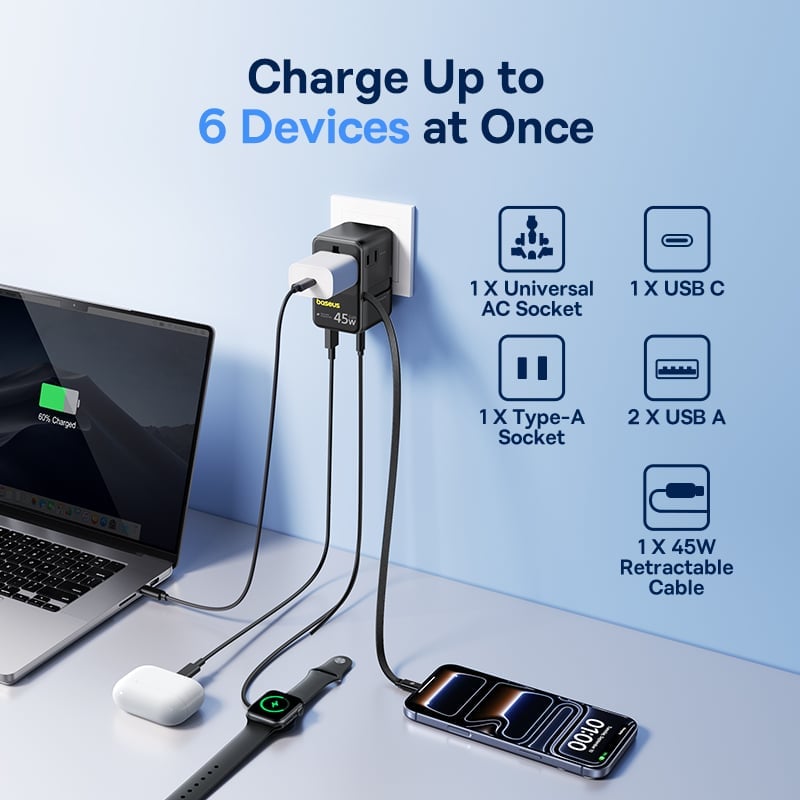 Tính năng Củ Sạc Du Lịch Toàn Cầu Baseus PicoGo AG11 45W (US/UK/EU/AU, with Retractable Cable, 2*AC Outlet+ 2*USB-A + 2*Type-C port)
