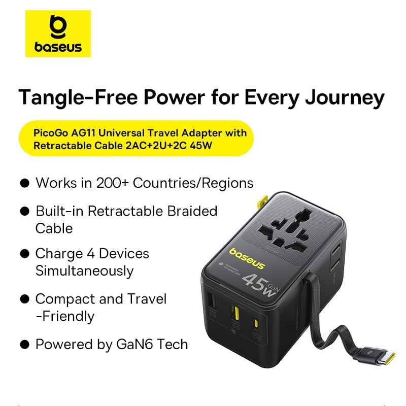 Giới thiệu Củ Sạc Du Lịch Toàn Cầu Baseus PicoGo AG11 45W (US/UK/EU/AU, with Retractable Cable, 2*AC Outlet+ 2*USB-A + 2*Type-C port)
