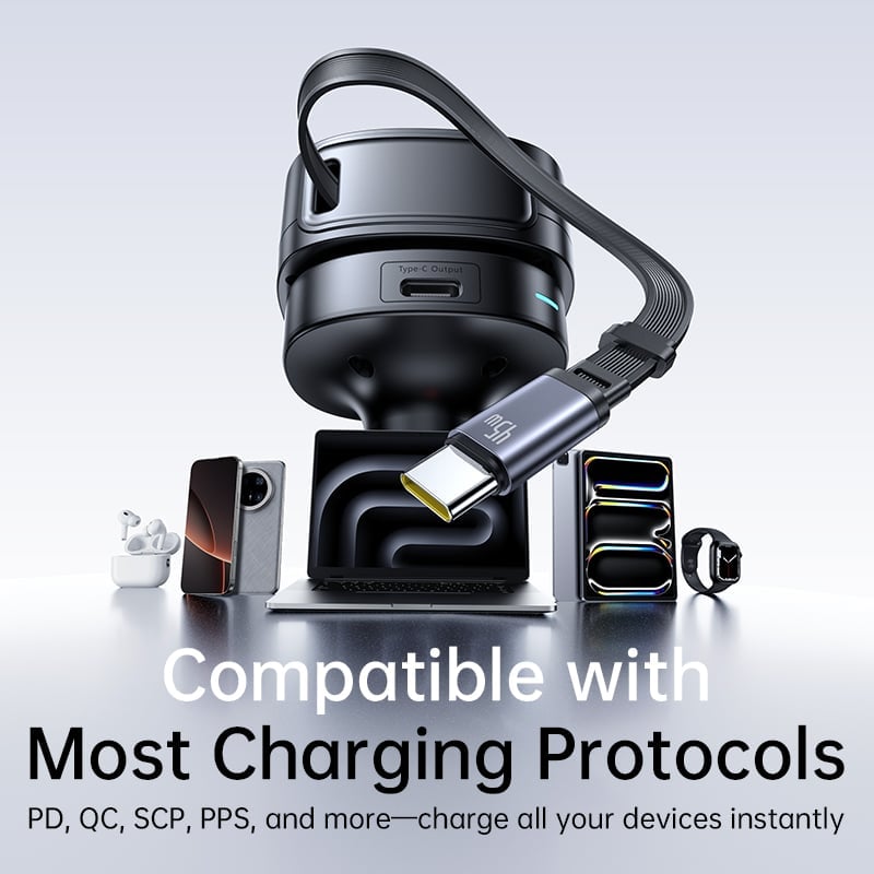 Một trong những tính năng nổi bật của PrimeTrip VR1 là cáp sạc tích hợp có thể rút gọn (Type-C và Lightning) 0.8m, giúp bạn không còn lo lắng về tình trạng dây sạc rối rắm hay thất lạc. Thiết kế này mang lại sự gọn gàng và tiện dụng tối đa trong không gian nội thất xe.