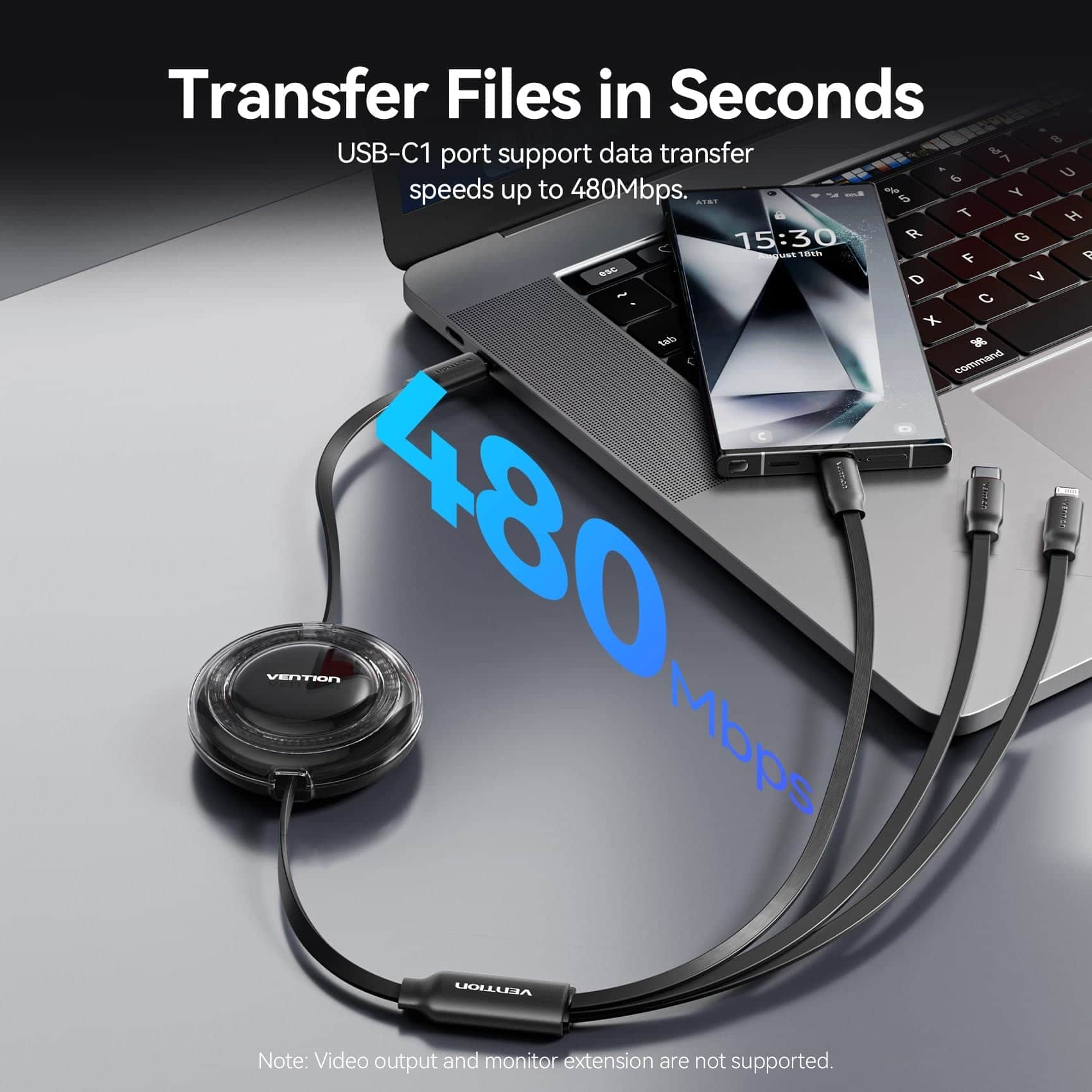 • Tên tiếng Việt: Cáp Sạc Dây Rút Đa Năng 3-in-1 C to L+2C VENTION TRK 100W (1.1m, 5A, 480Mbps)