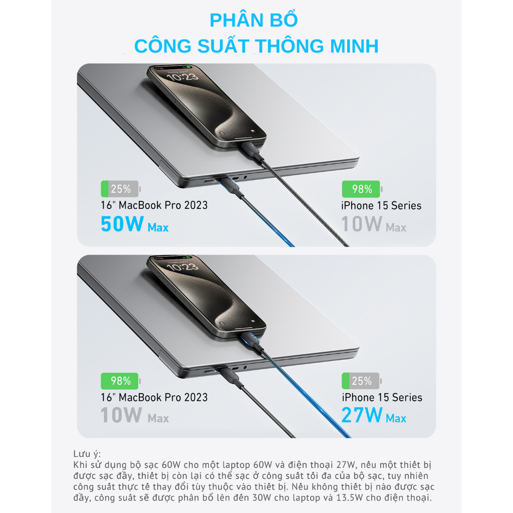 Sợi cáp này hỗ trợ công suất sạc lên đến 140W, đảm bảo khả năng sạc nhanh chóng cho cả những thiết bị đòi hỏi nguồn điện lớn như laptop, máy tính bảng và điện thoại thông minh. Tuy nhiên, công suất sẽ được chia sẻ giữa hai cổng USB-C khi sạc đồng thời.