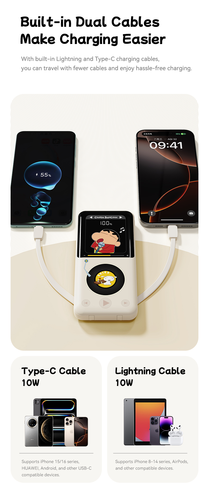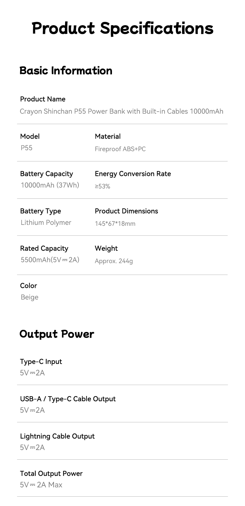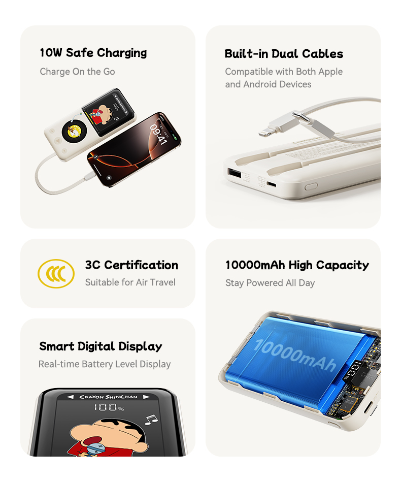 Tính năng Pin Dự Phòng ROCK Crayon Shinchan P55 10000mAh 10W (with Built-in Cables, Smart Digital Display)