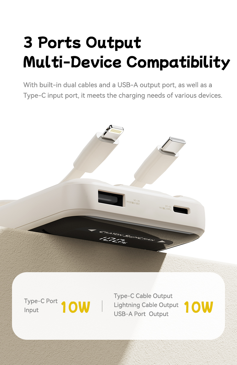 Điểm nhấn đặc biệt nhất chính là 2 sợi cáp sạc Lightning và USB-C được tích hợp gọn gàng ngay trên thân pin. Bạn sẽ không bao giờ phải nhớ nhớ quên quên việc mang theo cáp sạc nữa!