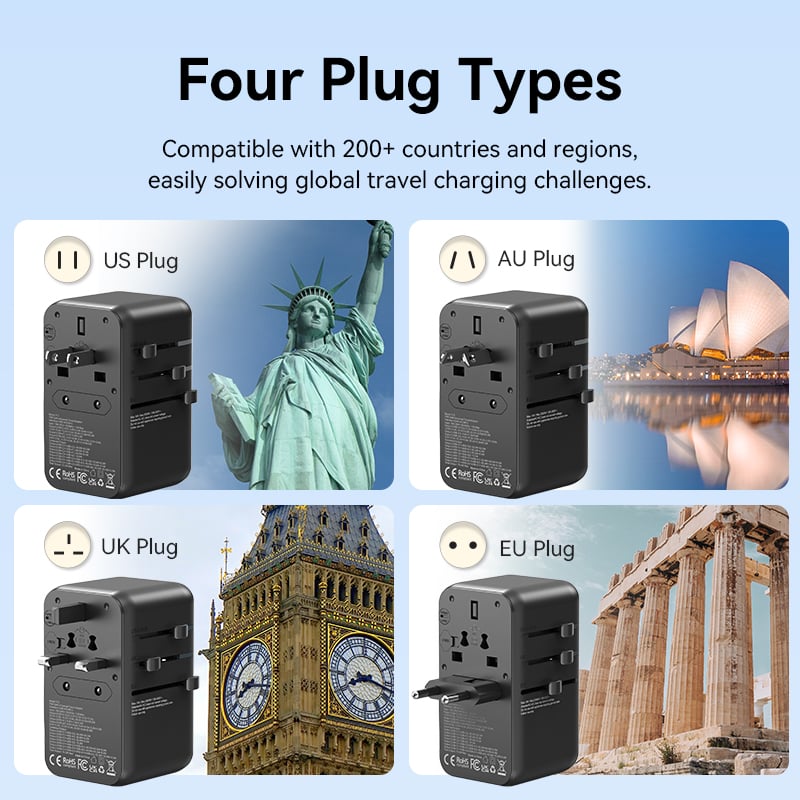 Đi kèm 4 loại phích cắm tích hợp, tương thích với hơn 200 quốc gia và khu vực. Hỗ trợ 8 tiêu chuẩn ổ cắm phổ biến, phù hợp với hầu hết các loại phích cắm trên toàn thế giới.