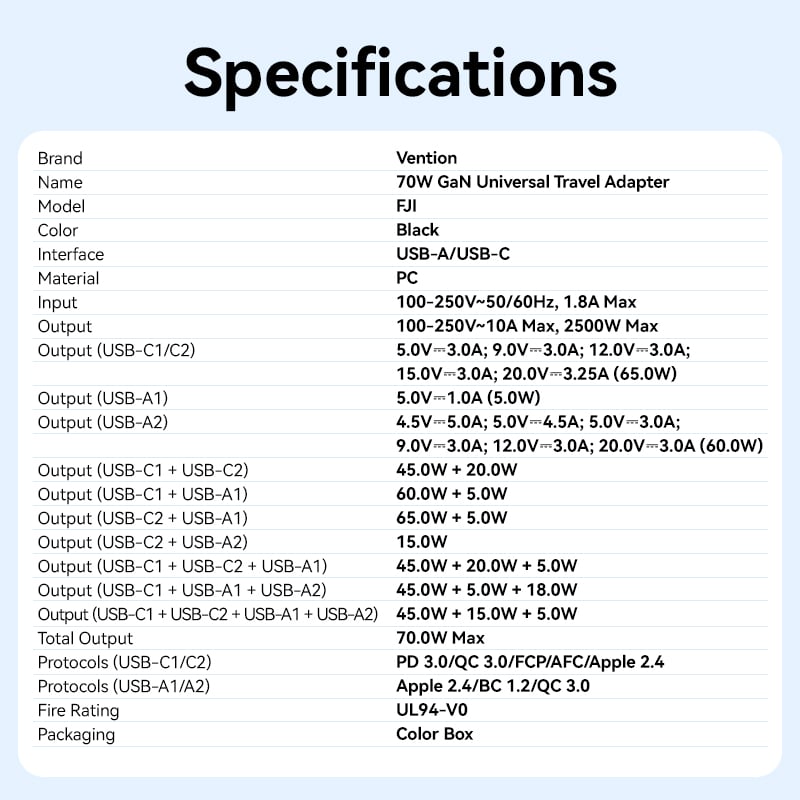 Củ Sạc Nhanh Đa Năng Du Lịch Toàn Cầu 1C + 2A VENTION FJI (GaN V, 65W/60W/5W, with Built-in USB-C Cable) – người bạn đồng hành không thể thiếu cho mọi tín đồ du lịch. Tích hợp công nghệ GaN V tiên tiến, khả năng sạc nhanh mạnh mẽ và thiết kế linh hoạt, đảm bảo mọi thiết bị của bạn luôn đầy pin, dù bạn ở bất cứ đâu trên thế giới.
