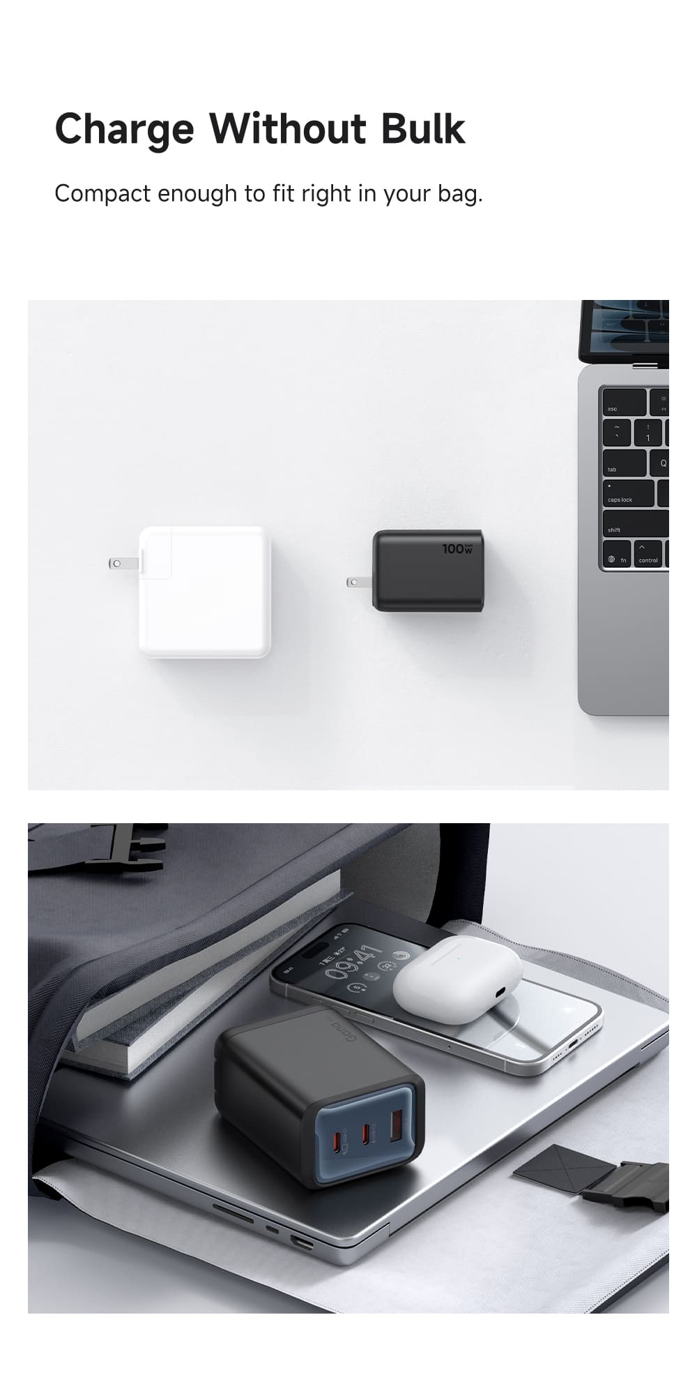 - Chân cắm gập 90 độ: Thiết kế chân cắm (US Plug) có thể gập gọn vào thân sạc, giúp bảo vệ chân cắm khỏi gãy gập và chống trầy xước cho các đồ vật khác trong balo.