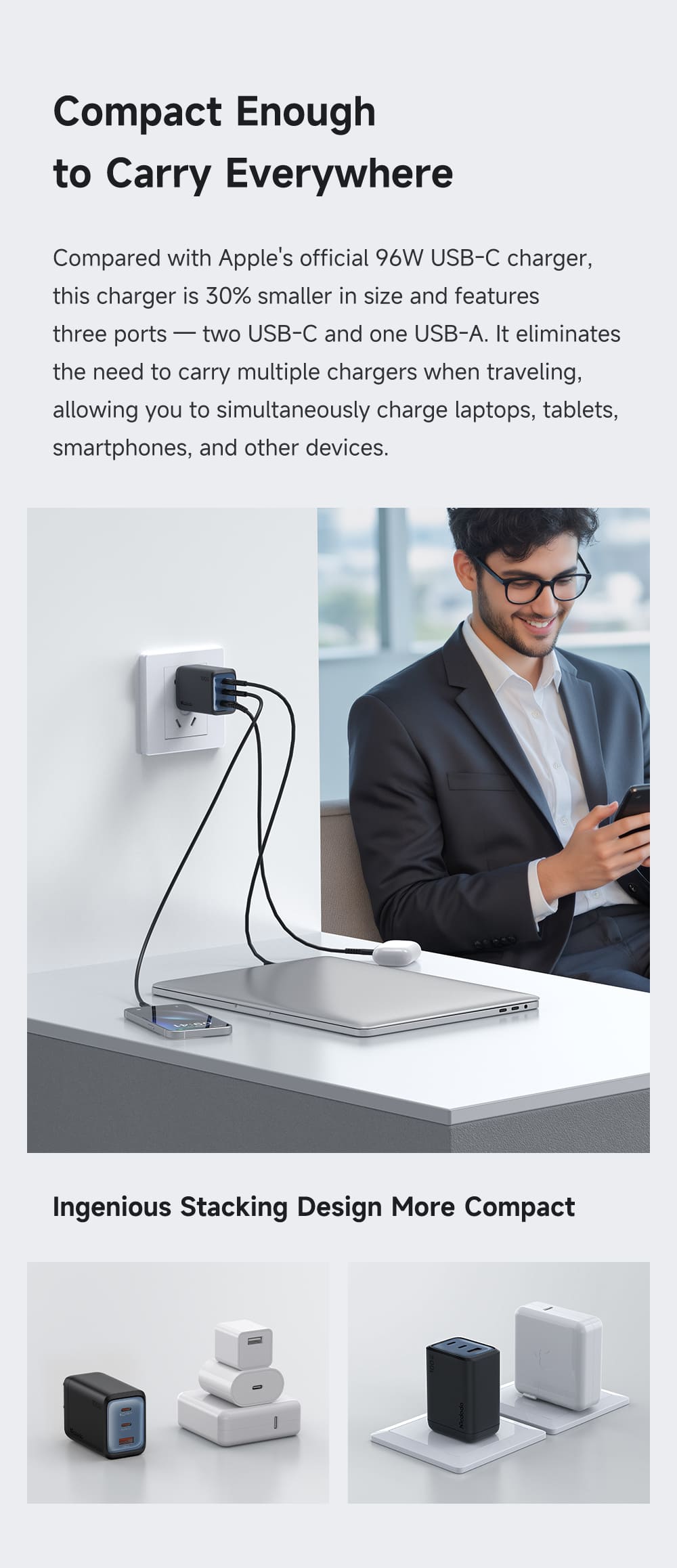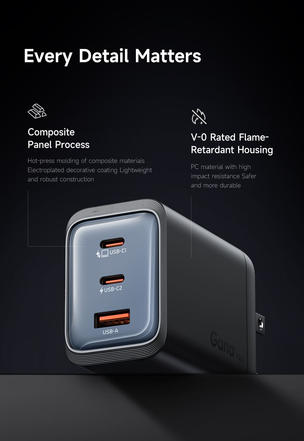 - Chân cắm gập 90 độ: Thiết kế chân cắm (US Plug) có thể gập gọn vào thân sạc, giúp bảo vệ chân cắm khỏi gãy gập và chống trầy xước cho các đồ vật khác trong balo.