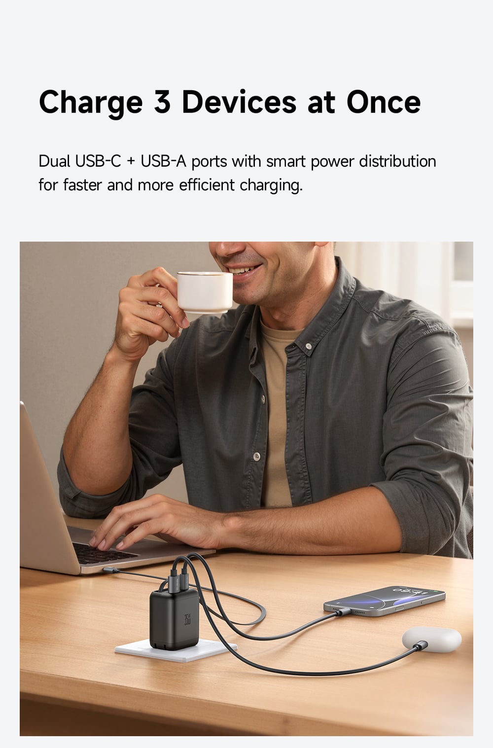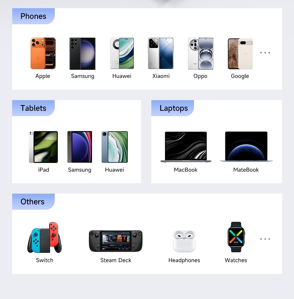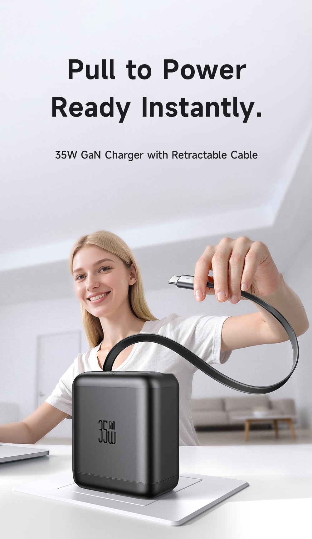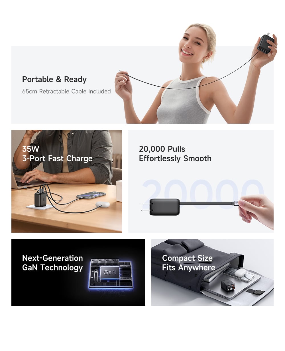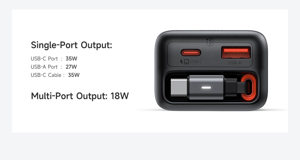 - Cáp Type-C tích hợp và Cổng USB-C đều hỗ trợ sạc nhanh chuẩn PD lên tới 35W. Mức công suất này đủ để sạc nhanh cho iPhone, iPad, các dòng điện thoại Samsung, Android và thậm chí là MacBook Air.