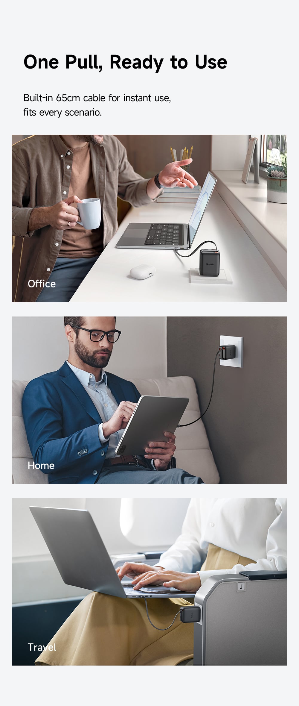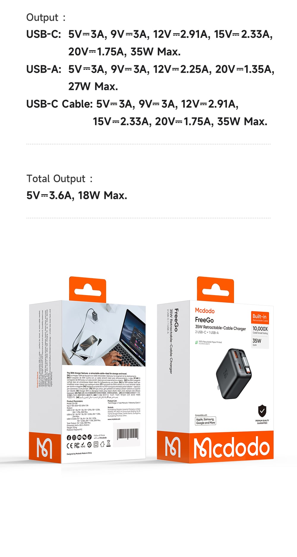 Tính năng Củ Sạc Nhanh MCDODO FreeGo Series CH-129 35W (1*Type-C + 1*USB-A port + 65cm Type-C built-in cable)