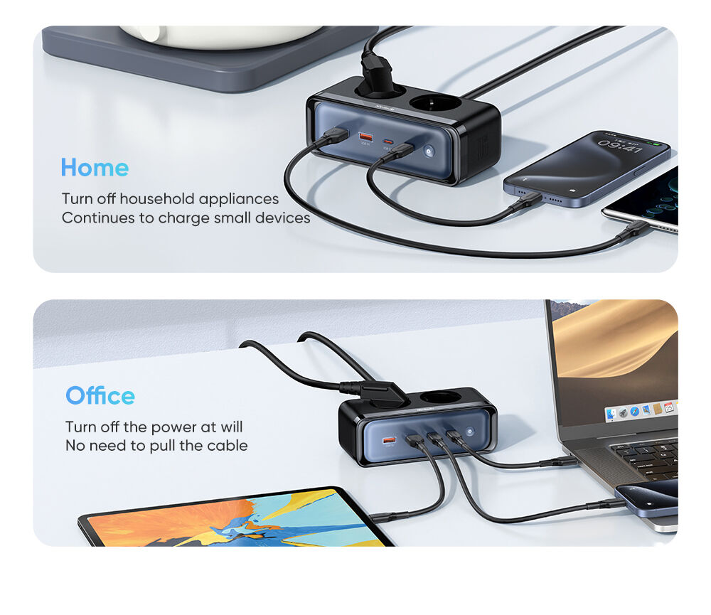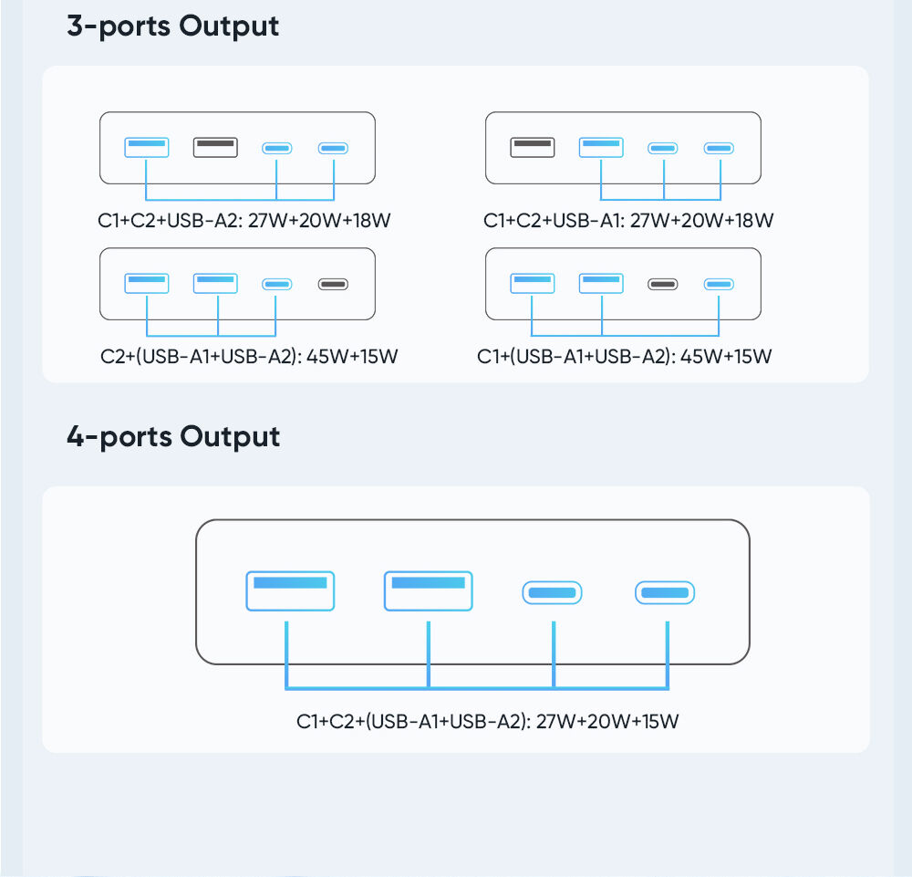 - Chia dòng thông minh: Khi sạc nhiều thiết bị cùng lúc, chip thông minh sẽ tự động phân bổ công suất (ví dụ: 27W + 20W + 15W) để đảm bảo mọi thiết bị đều được sạc ở tốc độ tối ưu nhất.