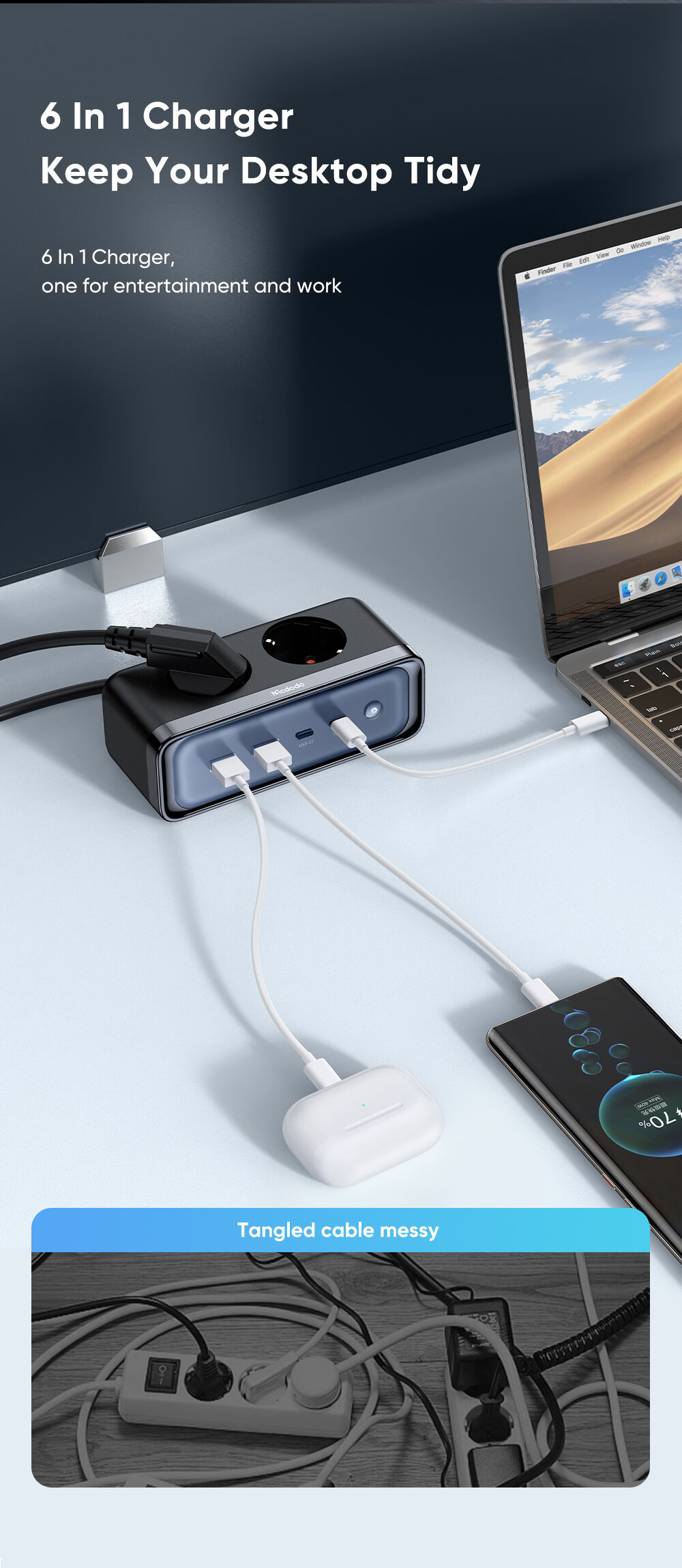 Mcdodo CH-461 thay thế hoàn toàn đống dây nhợ lằng nhằng bằng 6 đầu ra tiện lợi trên một thân máy nhỏ gọn: