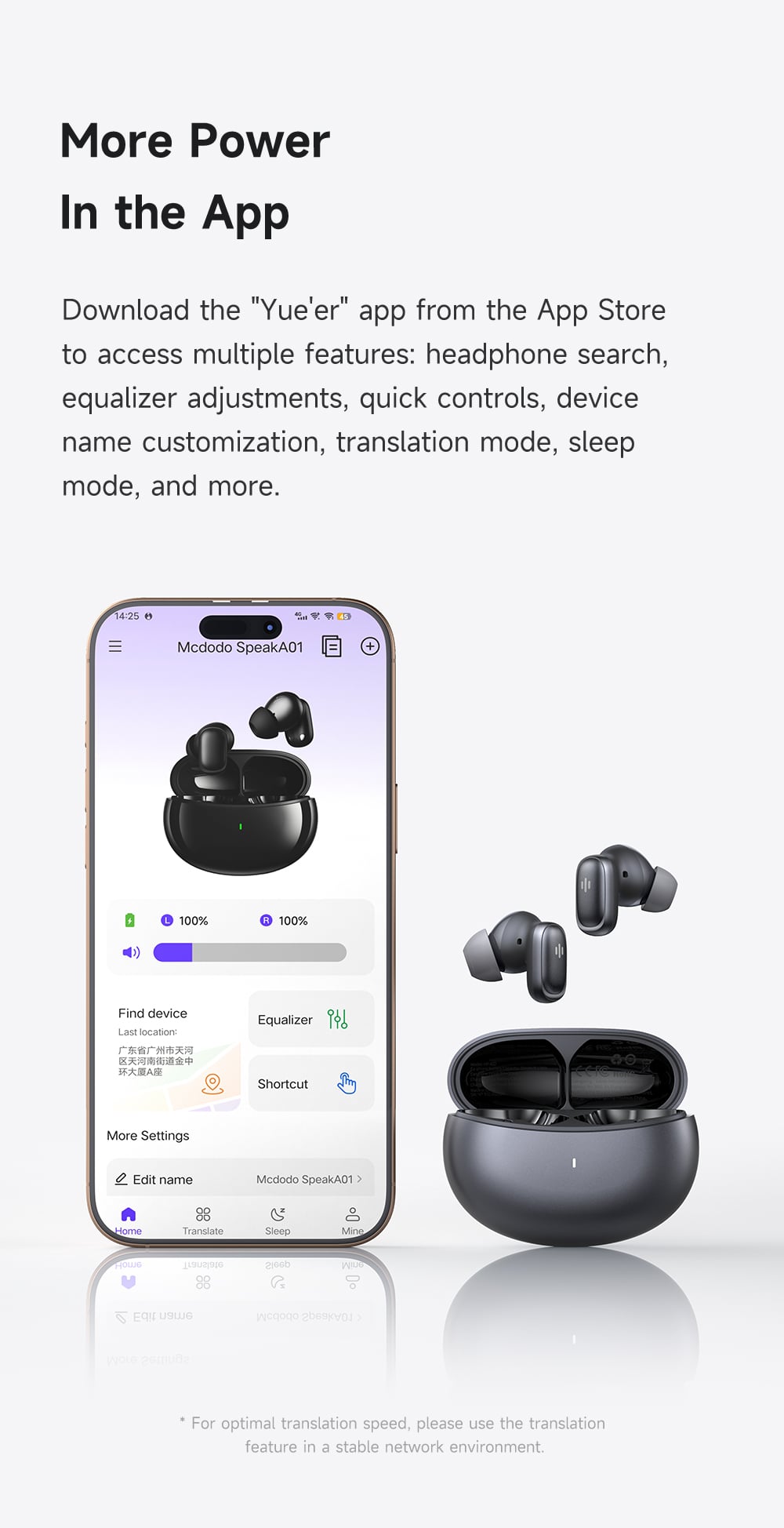 - Quản lý thông minh: Bạn có thể tùy chỉnh các chế độ âm thanh, cập nhật phần mềm và thiết lập tính năng dịch thuật thông qua ứng dụng chính thức của Mcdodo.