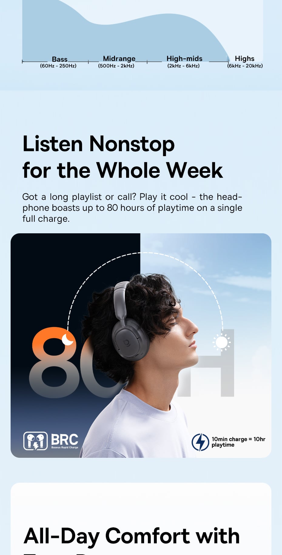 Với thời lượng pin ấn tượng, Baseus Bass BH1 có thể phát nhạc liên tục lên tới 80 giờ, đáp ứng tốt nhu cầu nghe nhạc, xem phim cả ngày dài.