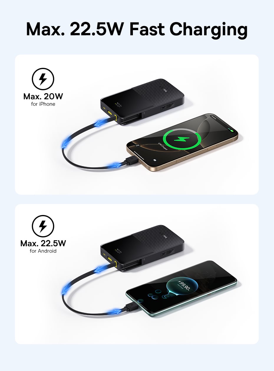 Hỗ trợ công suất sạc tối đa 22.5W, giúp nạp đầy pin cho điện thoại, máy tính bảng và các thiết bị khác một cách nhanh chóng, tiết kiệm thời gian chờ đợi.
