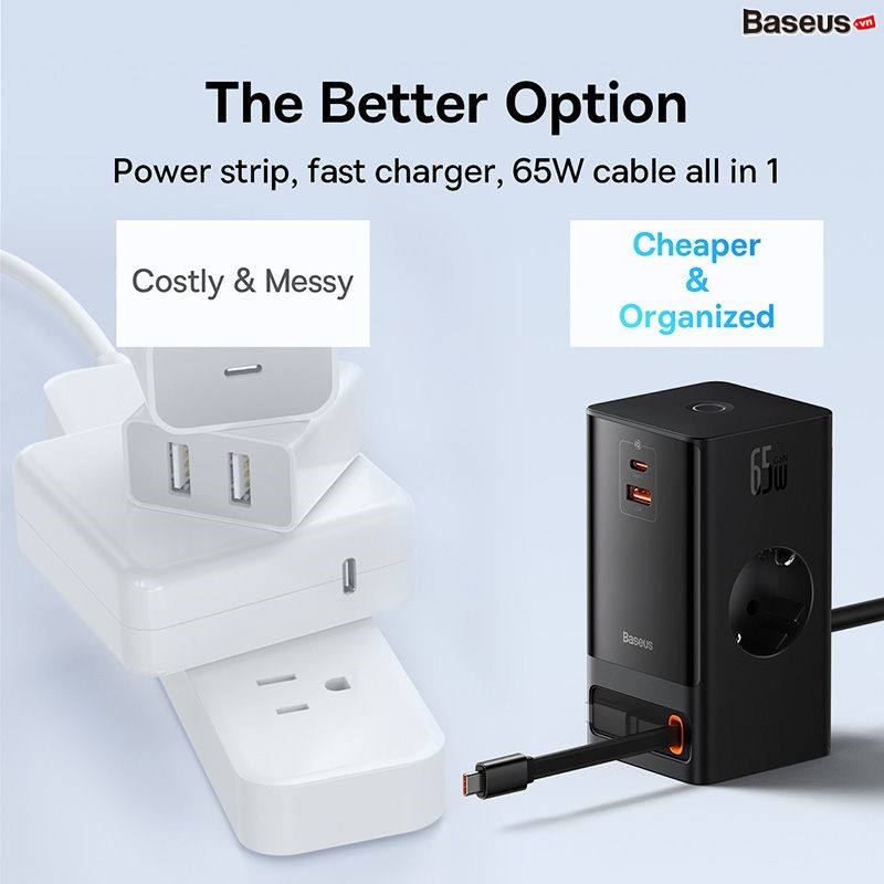 Với việc tích hợp dây dẫn nguồn AC nối dài kèm theo 3 ổ cắm điện AC, Baseus PowerCombo Digital Powerstrip không chỉ là một củ sạc đa năng mà nó còn được sử dụng như một ổ cắm điện thông minh, đáp ứng mọi nhu cầu và không gian làm việc của bạn. Chỉ với Baseus PowerCombo Digital PowerStrip có thể đảm bảo cấp nguồn cho tất cả các thiết bị của bạn từ AC đến DC.