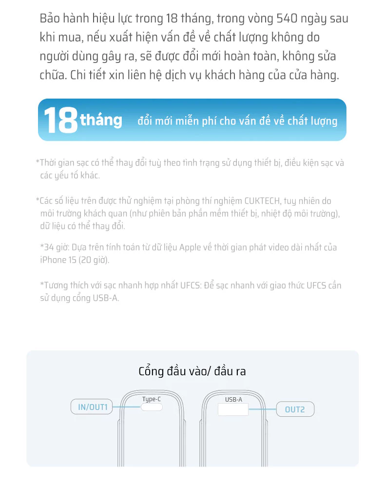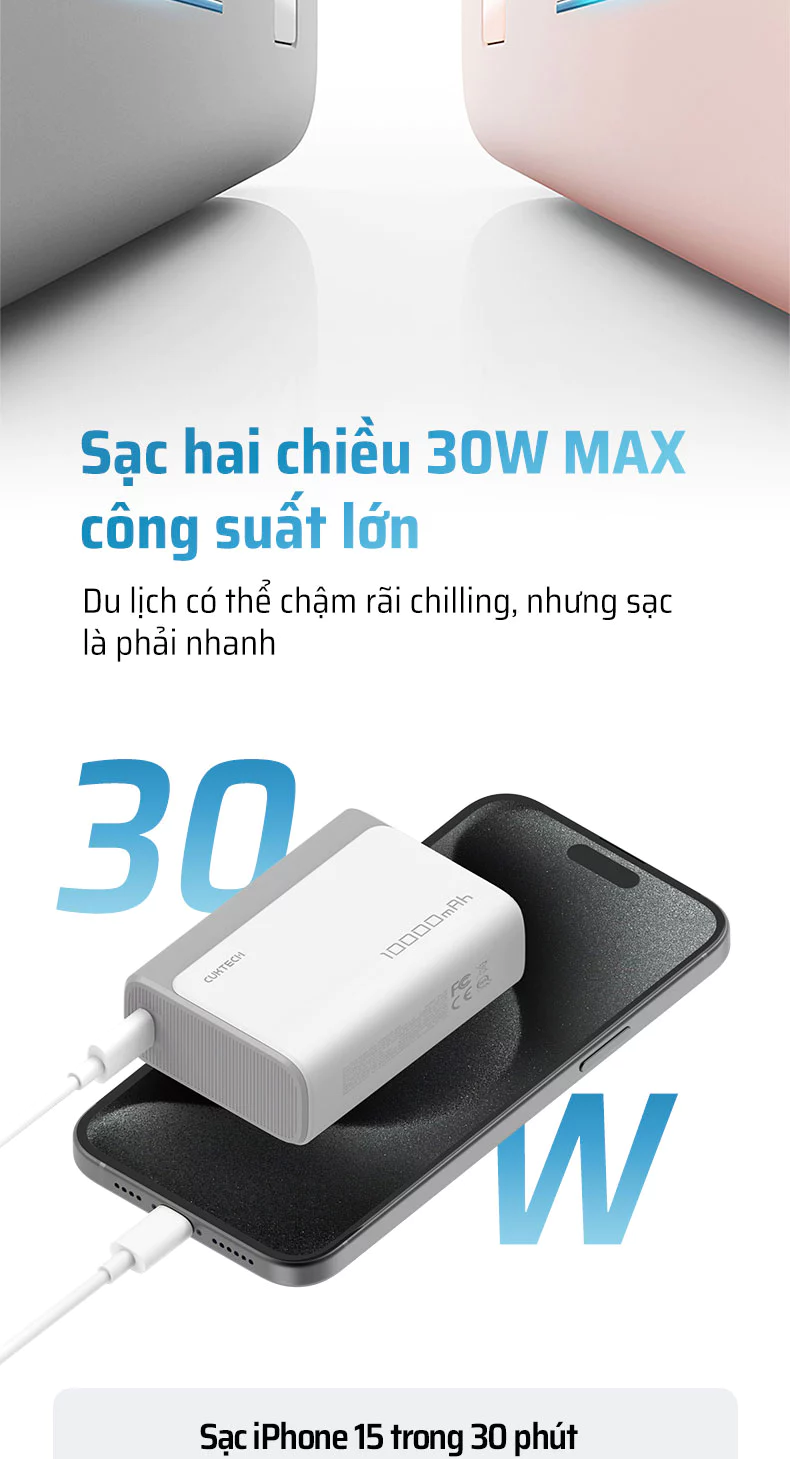 Với công suất đầu ra qua cổng Type-C lên đến 30W, Cuktech CP13 có khả năng sạc đầy 55% pin cho iPhone 15 chỉ trong 30 phút, giúp bạn tiết kiệm thời gian chờ đợi đáng kể.