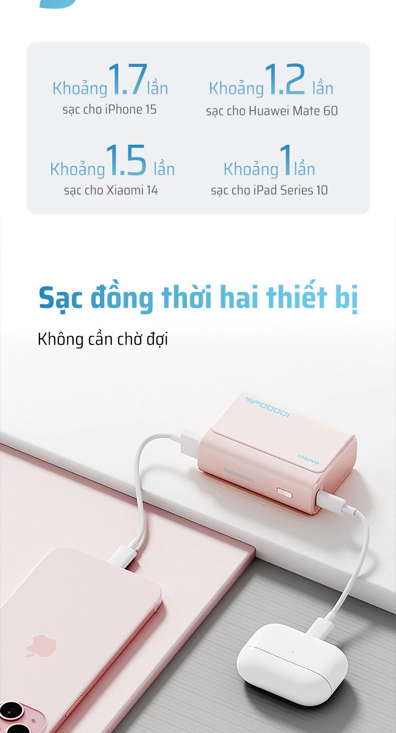 Mức dung lượng lớn cho phép bạn sạc đầy iPhone 15 khoảng 1.8 lần hoặc Samsung S24 khoảng 1.6 lần. Bạn có thể hoàn toàn yên tâm sử dụng thiết bị suốt cả ngày dài.