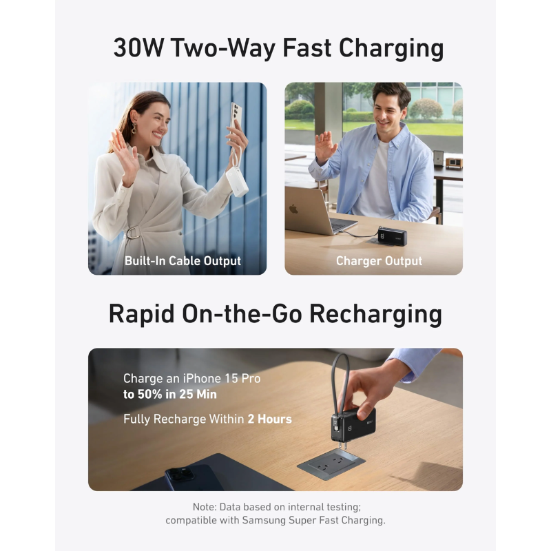 Chế độ Pin dự phòng: Khi rút ra khỏi ổ cắm, Anker A1637 ngay lập tức trở thành một viên pin dự phòng 10,000mAh mạnh mẽ, sẵn sàng cung cấp năng lượng cho thiết bị của bạn ở bất cứ đâu.