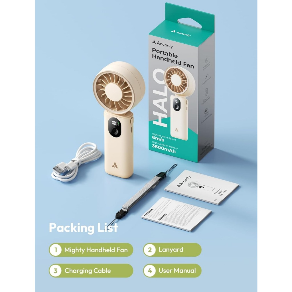 Giới thiệu Quạt Cầm Tay AECOOLY Halo 04 PE02 (3600mAh, 20H, 6m/s, 6000RPM, 5 Speed Settings, Digital Display)