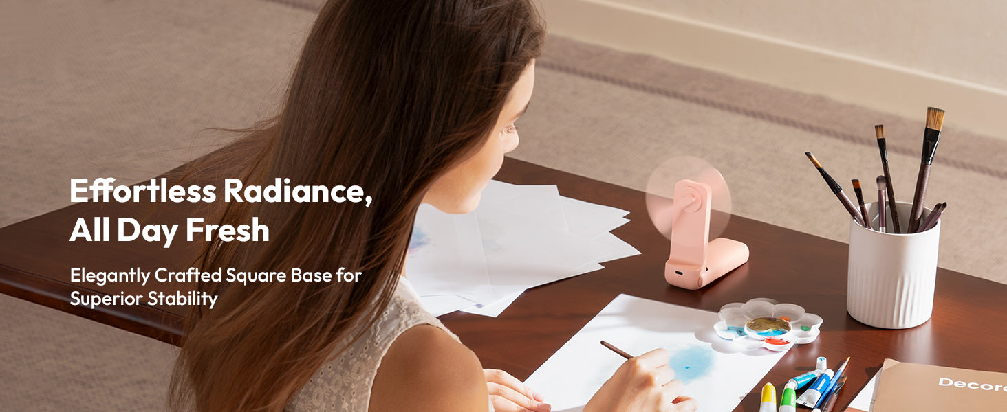 Thiết kế độc đáo cho phép bạn gấp gọn quạt một cách nhanh chóng và tiện lợi, giúp bảo vệ cánh quạt khi không sử dụng và tối ưu hóa không gian lưu trữ. Bạn có thể mở quạt 180° để sử dụng cầm tay linh hoạt hoặc gập 90° để biến nó thành một chiếc quạt để bàn, phù hợp cho việc học tập, làm việc hay thư giãn.