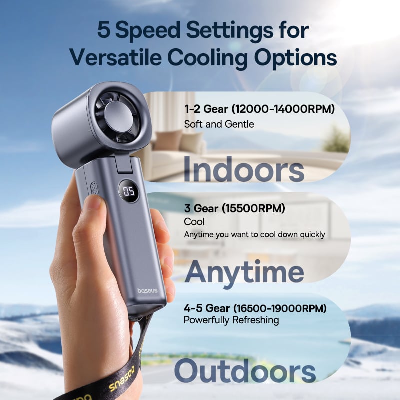 Tính năng Quạt Cầm Tay Baseus GoTrip DT1 High-Speed (4000mAh, 8.5H, Digital Display, 19000RPM & 5m/s, 5 Speed Settings, 90° Foldable)