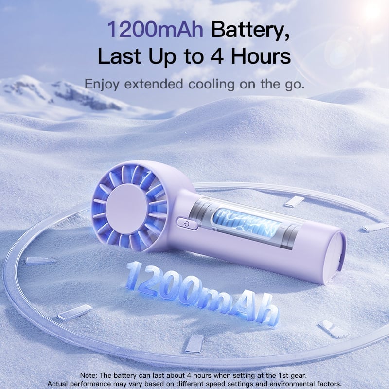 Được trang bị pin sạc 1200mAh, quạt cho thời gian sử dụng đáng kể chỉ với một lần sạc đầy (khoảng 2.5 giờ), đáp ứng nhu cầu làm mát liên tục trong nhiều giờ.