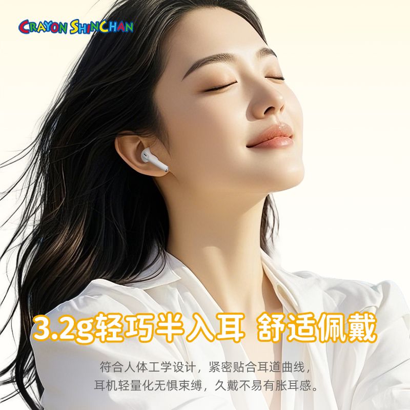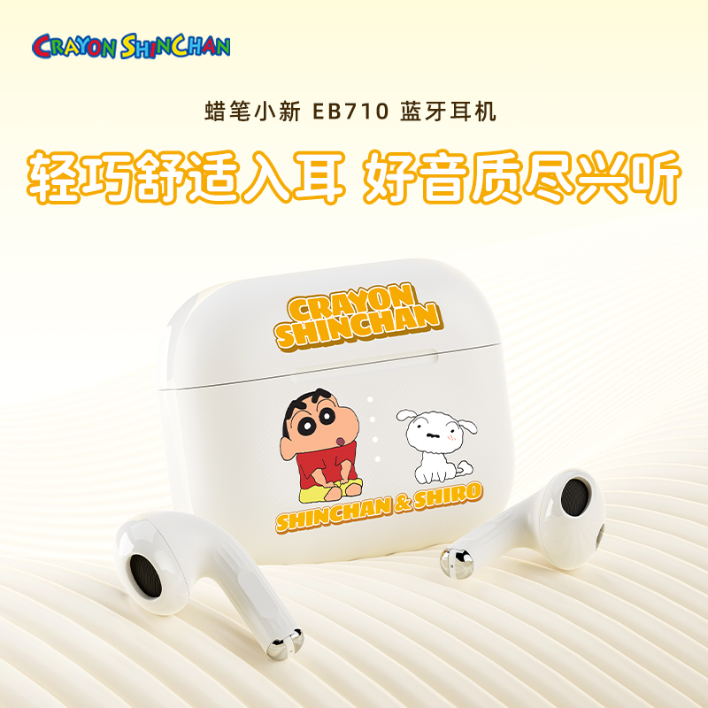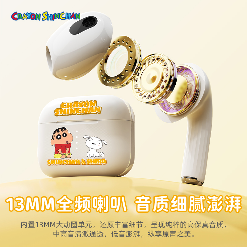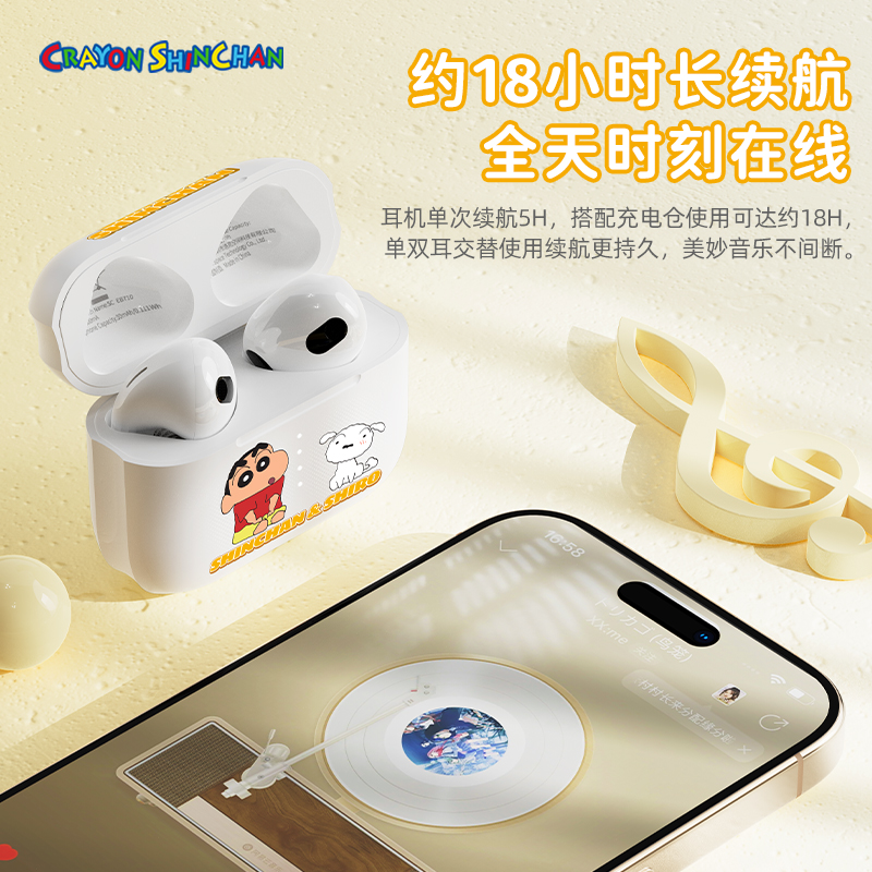 Hộp sạc và tai nghe mang tông trắng chủ đạo, in hình Shinchan ngộ nghĩnh, giúp bạn thể hiện cá tính ngay từ cái nhìn đầu tiên. Trọng lượng tổng chỉ 38g, đeo thoải mái suốt cả ngày mà không gây mỏi tai.