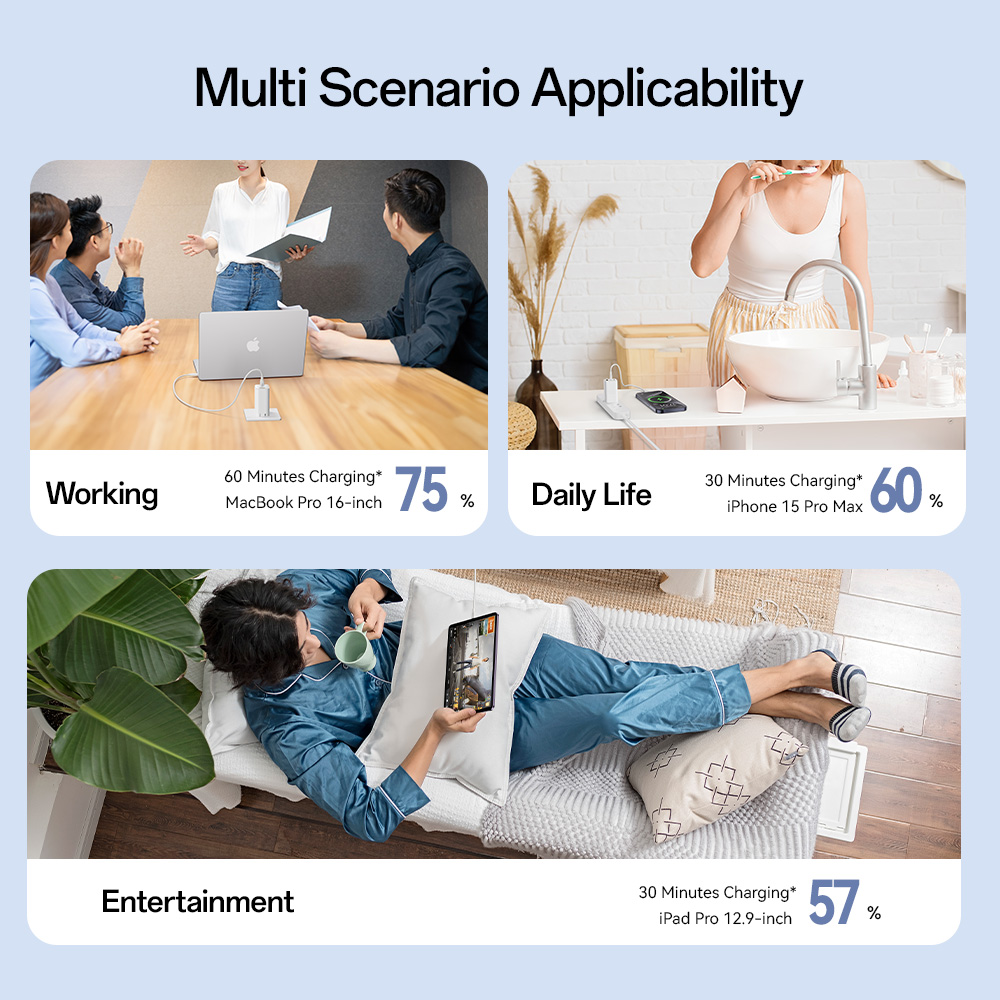 Với tổng công suất lên tới 65W, củ sạc nhanh giúp nạp đầy pin cho các thiết bị một cách nhanh chóng và ổn định, giúp tiết kiệm thời gian và đảm bảo hiệu năng làm việc liên tục.