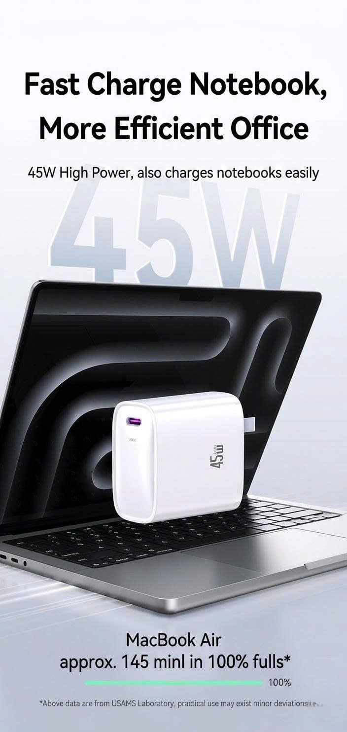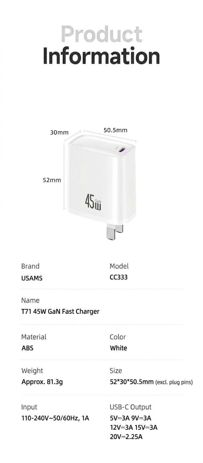 Nếu bạn đang tìm kiếm một giải pháp sạc gọn nhẹ nhưng vẫn đảm bảo tốc độ tối đa cho điện thoại, máy tính bảng hay thậm chí là laptop đời mới, USAMS CC333 T71 chính là sự lựa chọn không thể bỏ qua. Với công suất lên đến 45W, đây là phụ kiện năng lượng mạnh mẽ dành cho người dùng hiện đại.