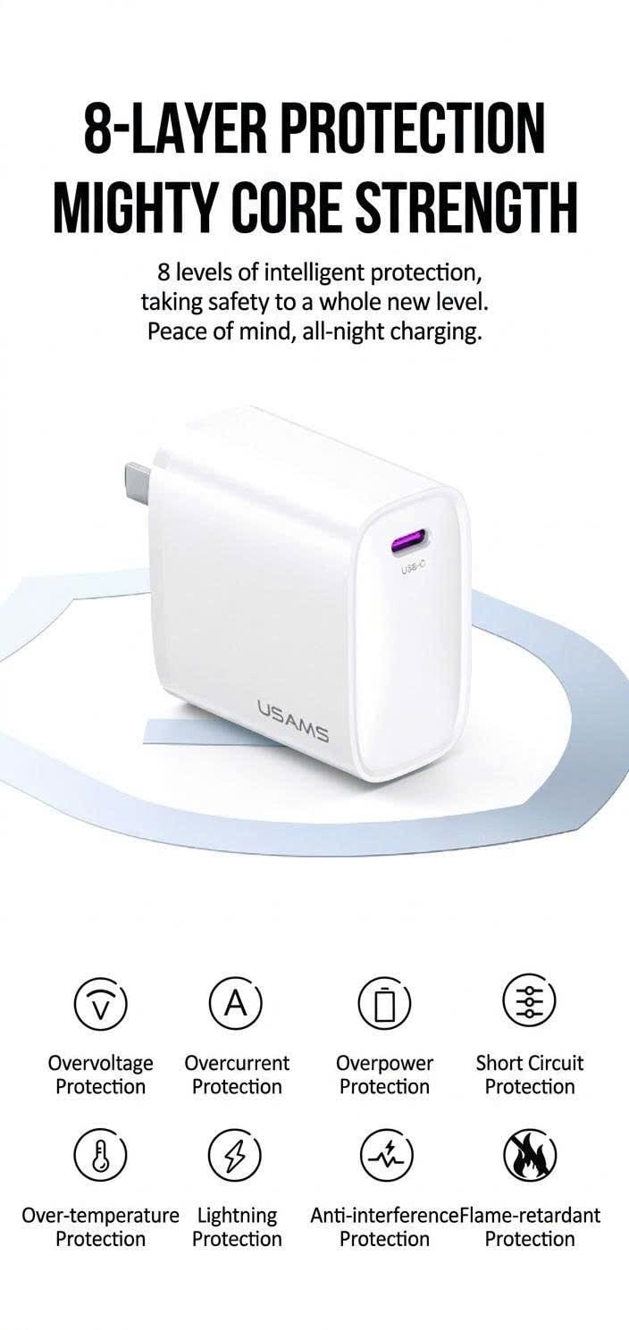 USAMS luôn chú trọng đến sự an toàn của người dùng. Củ sạc CC333 được tích hợp chip thông minh hỗ trợ đa lớp bảo vệ: