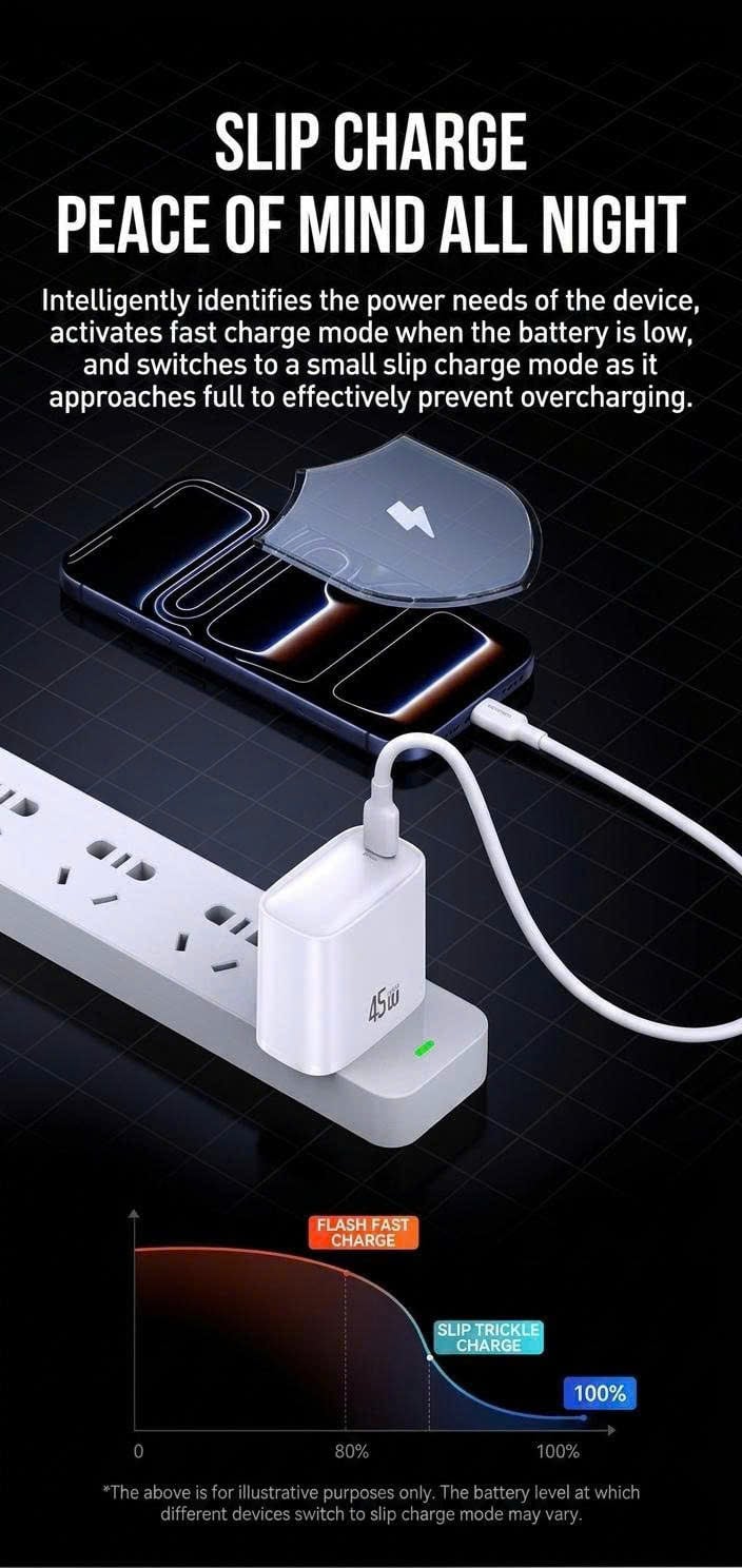 Được trang bị cổng Type-C hỗ trợ các chuẩn sạc nhanh hàng đầu hiện nay, củ sạc mang đến dòng điện ổn định và mạnh mẽ. Công suất 45W đủ để cung cấp năng lượng cho: