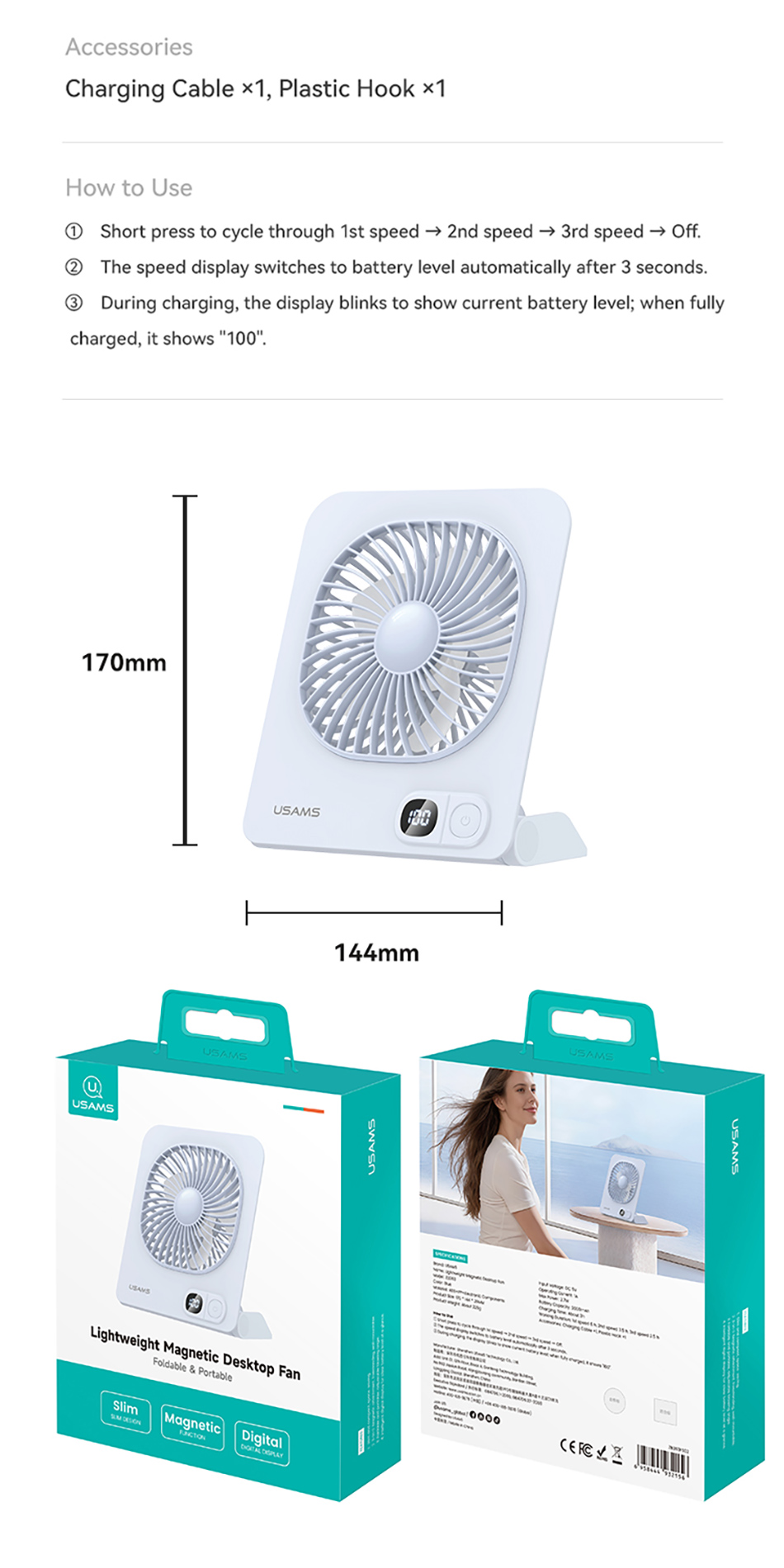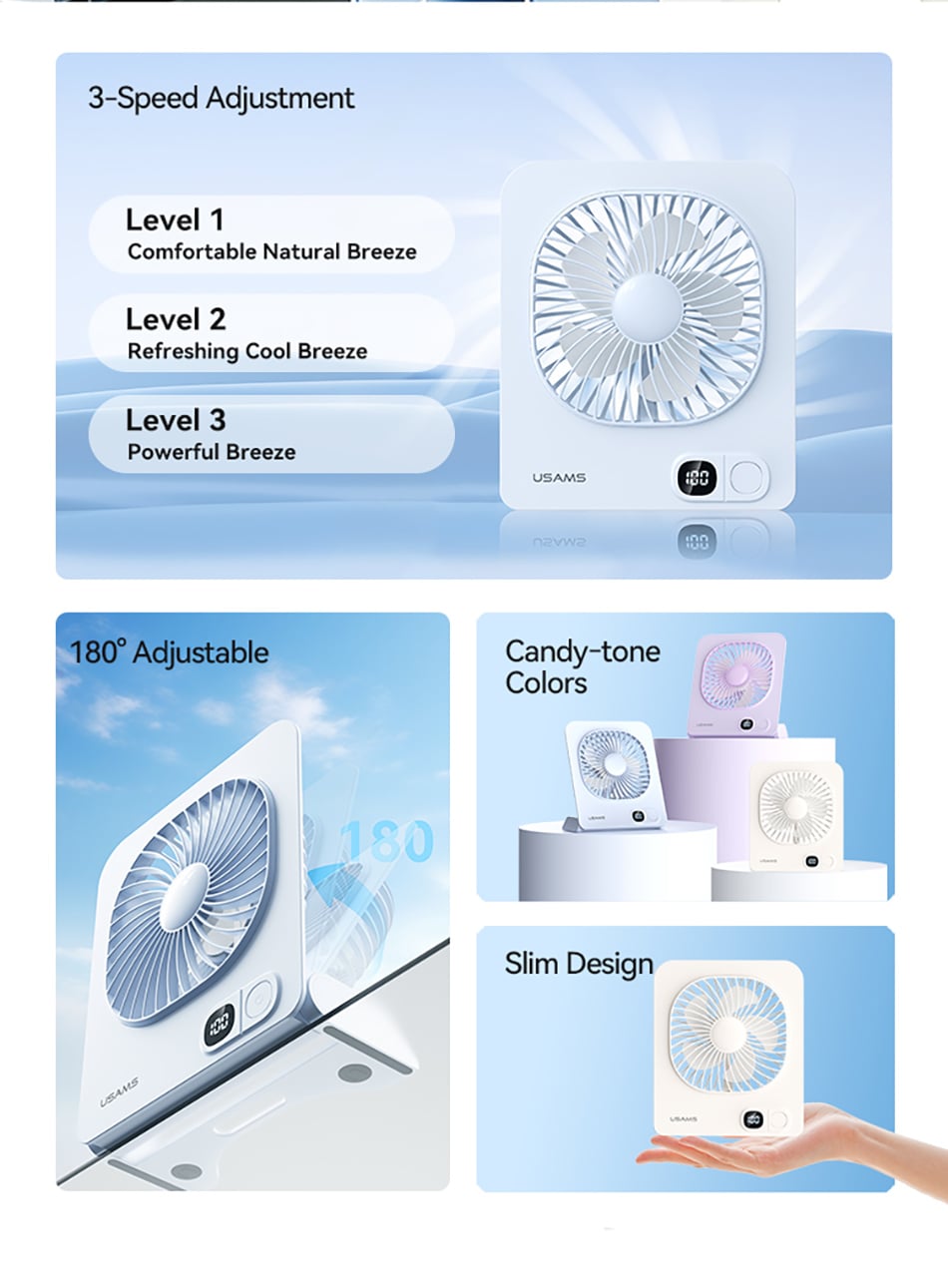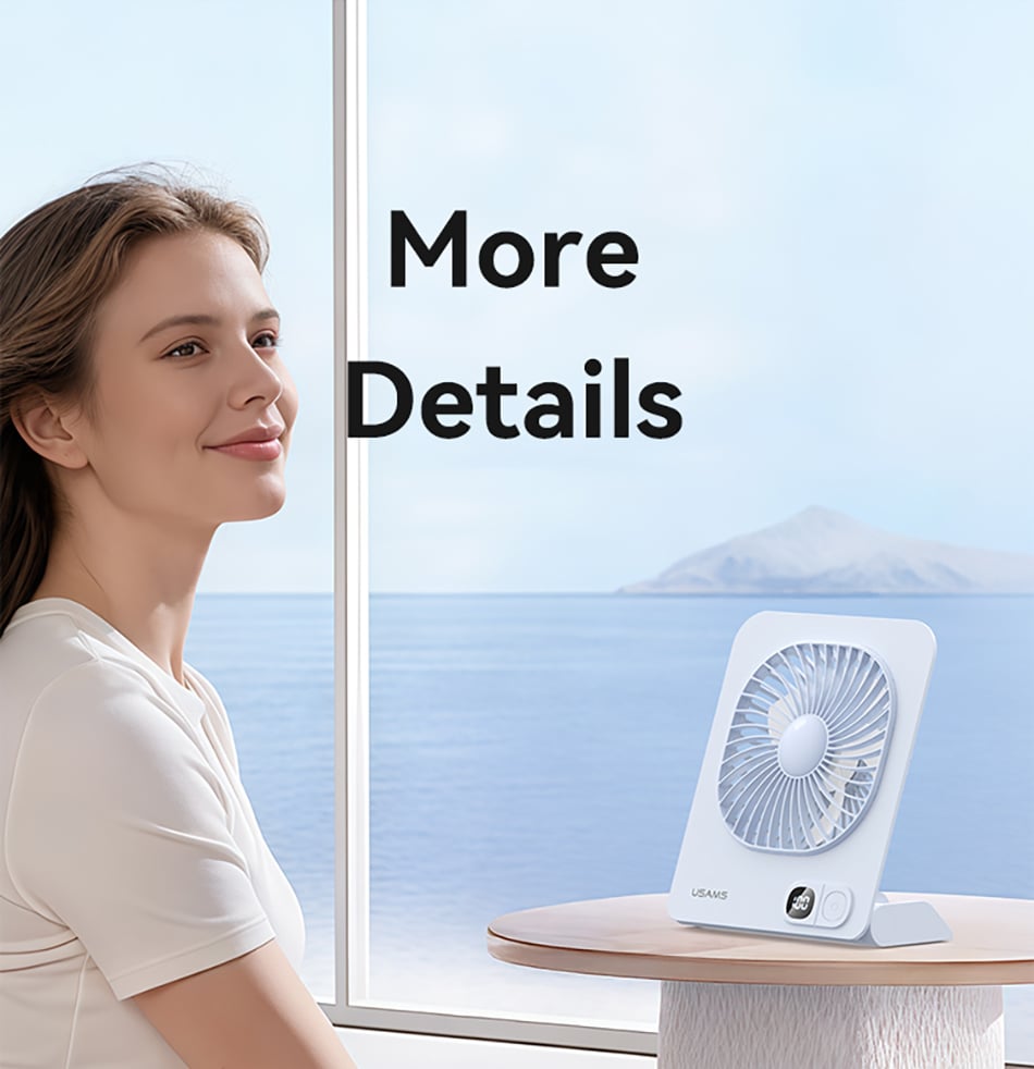 • Tên tiếng Việt: Quạt Để Bàn Kiêm Chân Đế Từ Tính USAMS ZB363 2.7W (2000mAh, 6H, 3-Speed Adjustment, Digital Display, 180° Adjustable)