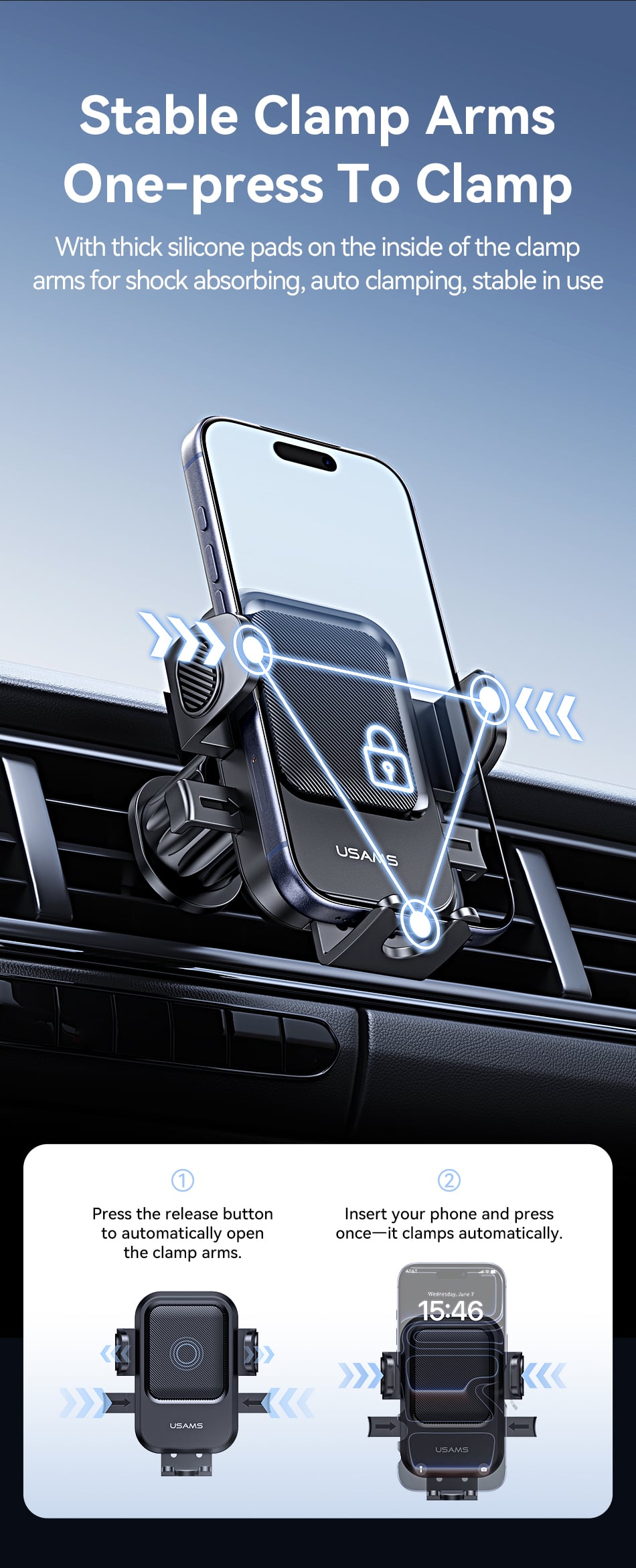 USAMS ZJ090 nổi bật với thiết kế thông minh cho phép bạn đặt và lấy điện thoại chỉ với một thao tác đơn giản. Khi bạn đặt điện thoại vào, hệ thống ngàm kẹp sẽ tự động ôm khít lấy thiết bị, đảm bảo chắc chắn ngay cả khi xe đi qua những đoạn đường xóc hay phanh gấp.