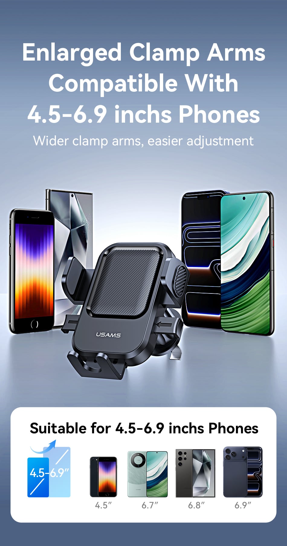 Giá đỡ có độ mở ngàm lớn, tương thích hoàn hảo với hầu hết các dòng smartphone hiện nay (từ 4.7 đến 6.9 inch), kể cả khi bạn đang sử dụng ốp lưng dày.