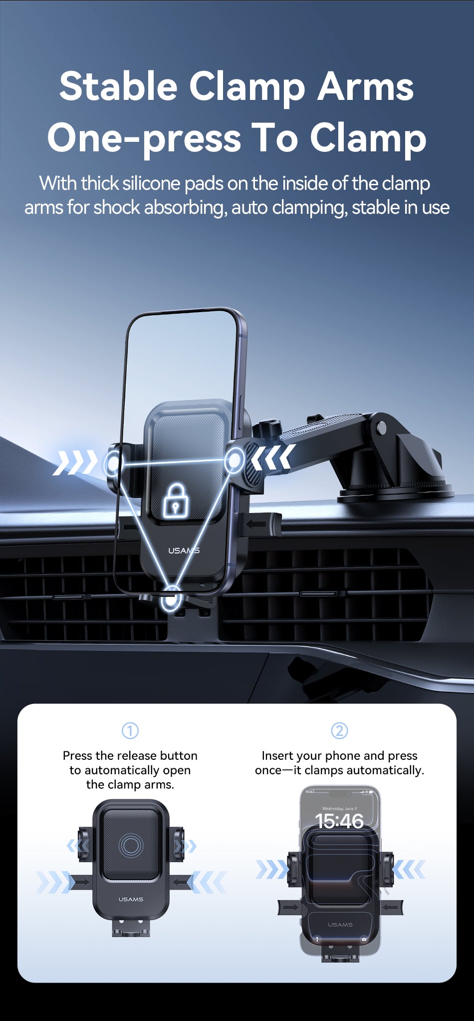 USAMS ZJ091 sử dụng cơ chế liên kết trọng lực (Gravity Linkage). Chỉ cần một thao tác đặt điện thoại xuống, trọng lượng của máy sẽ tác động làm các cánh tay kẹp tự động thu lại và ôm khít lấy thân máy.