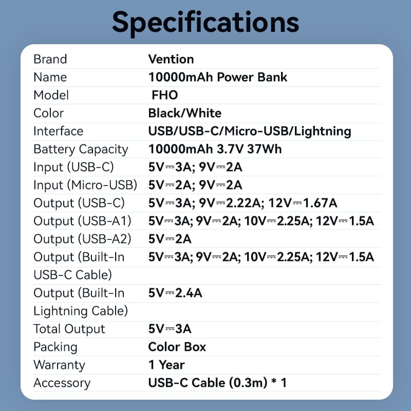 Giới thiệu Pin Dự Phòng VENTION FHO 10000mAh 22.5W (With Type-C + Lightning Cable, Digital Display, 1*Type-C + 2*USB-A Port, Micro-USB Input Port)
