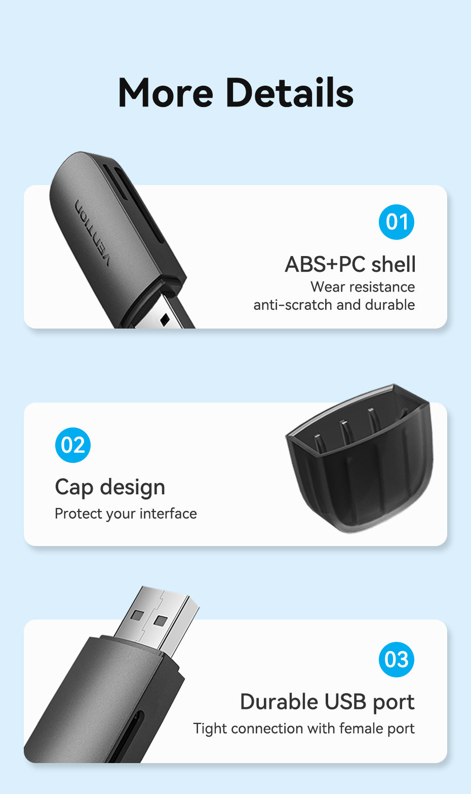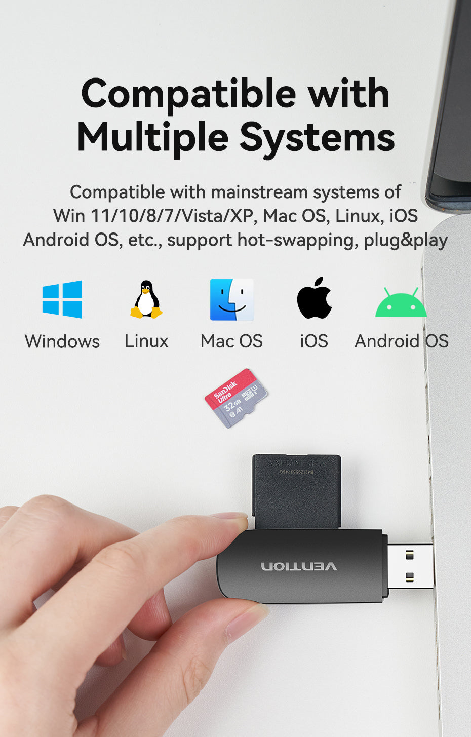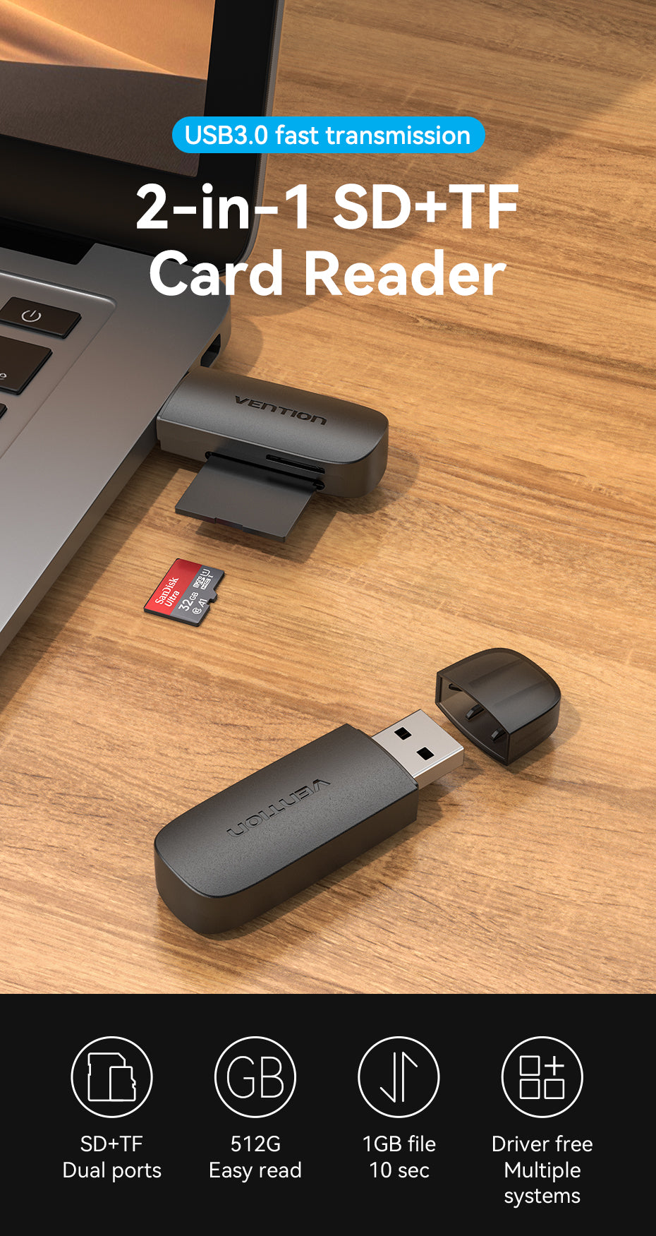 Tính năng Đầu Đọc Thẻ Nhớ 2-in-1 USB 3.0 A Card Reader(SD+TF) VENTION CLF (5Gbps)