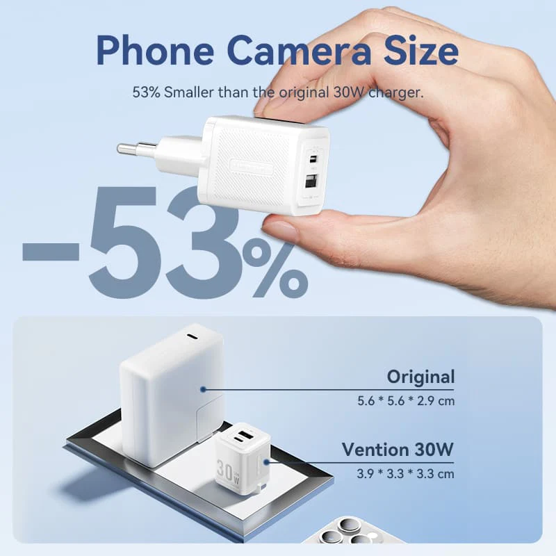 Vention 2-Port USB (C + A) GaN Charger (30W/30W) with USB-C to USB-C Cable (1M) EU-Plug Black ( TZ-FEQB0-EU-01 )