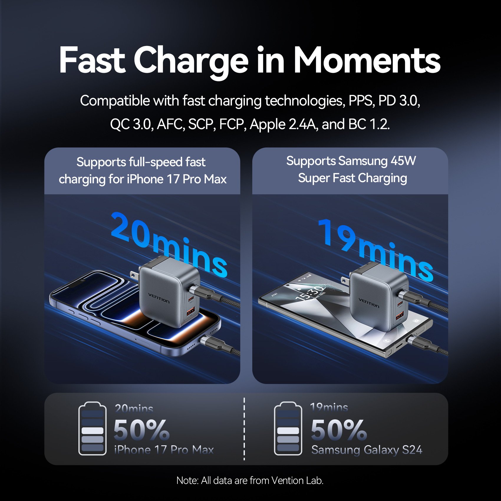 Vention 3-Port USB (C+C+A) GaN Charger (70W/70W/22.5W) US Plug (FEXH0-US) – GRAY
