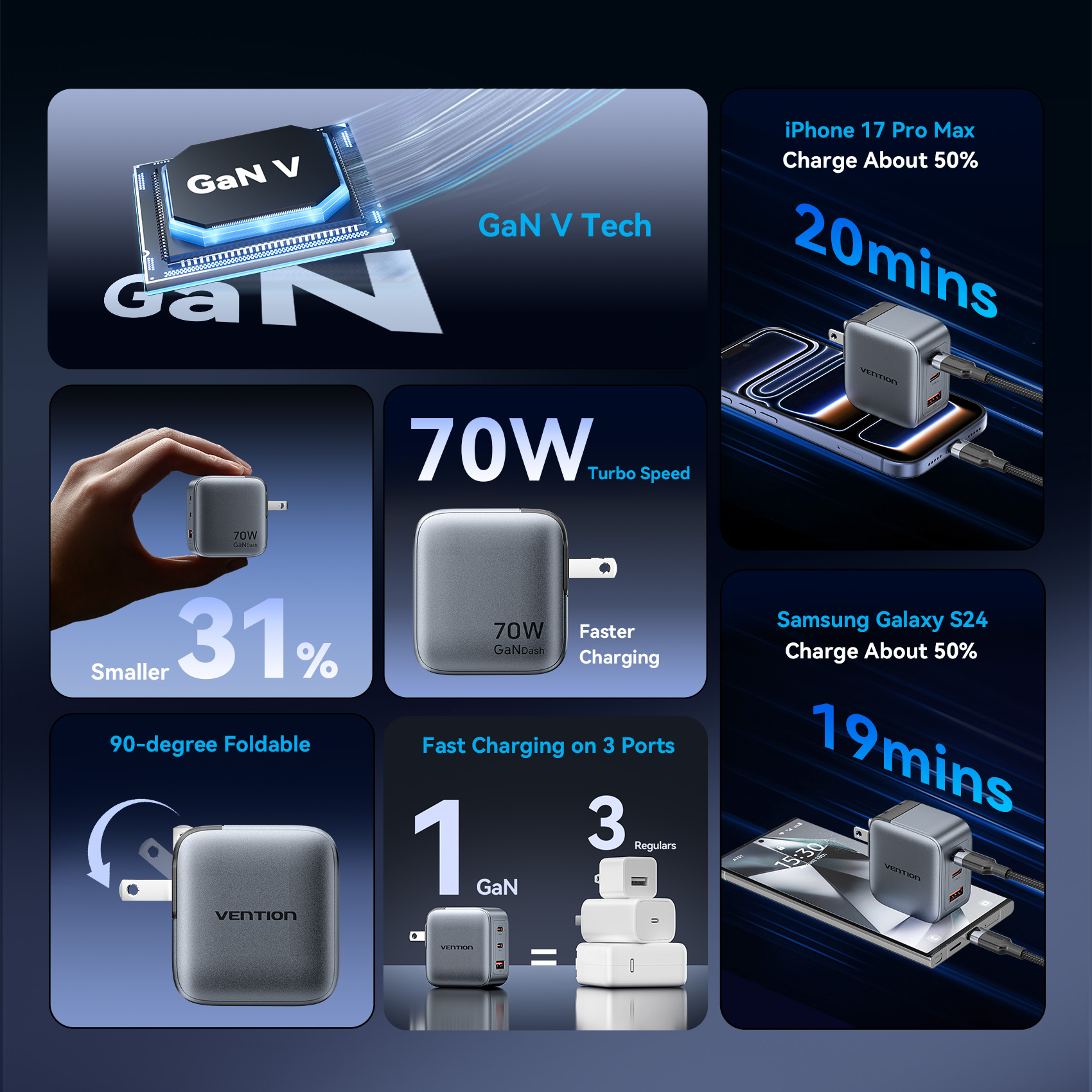 Tính năng Củ Sạc Nhanh VENTION FEX 70W (2*Type-C + 1*USB-A, GaN V Tech)